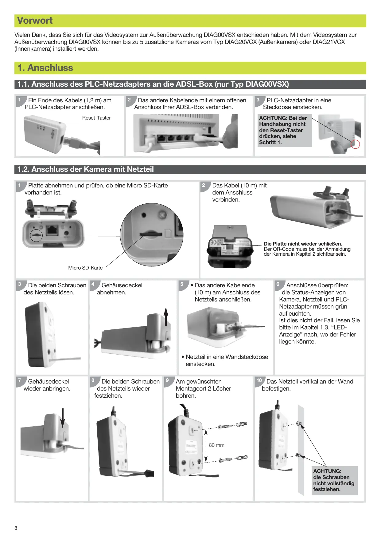 Nutzung, Veröffentlichung oder Verteilung von Bild- und/oder Tonaufnahmen). Achten Sie bei der Nutzung der Produkte und Dienstleistungen von Diagral darauf, dass Sie die am jeweiligen Ort geltenden Gesetze einhalten. 1.2. Branchement de la caméra avec le bloc alimentation 1