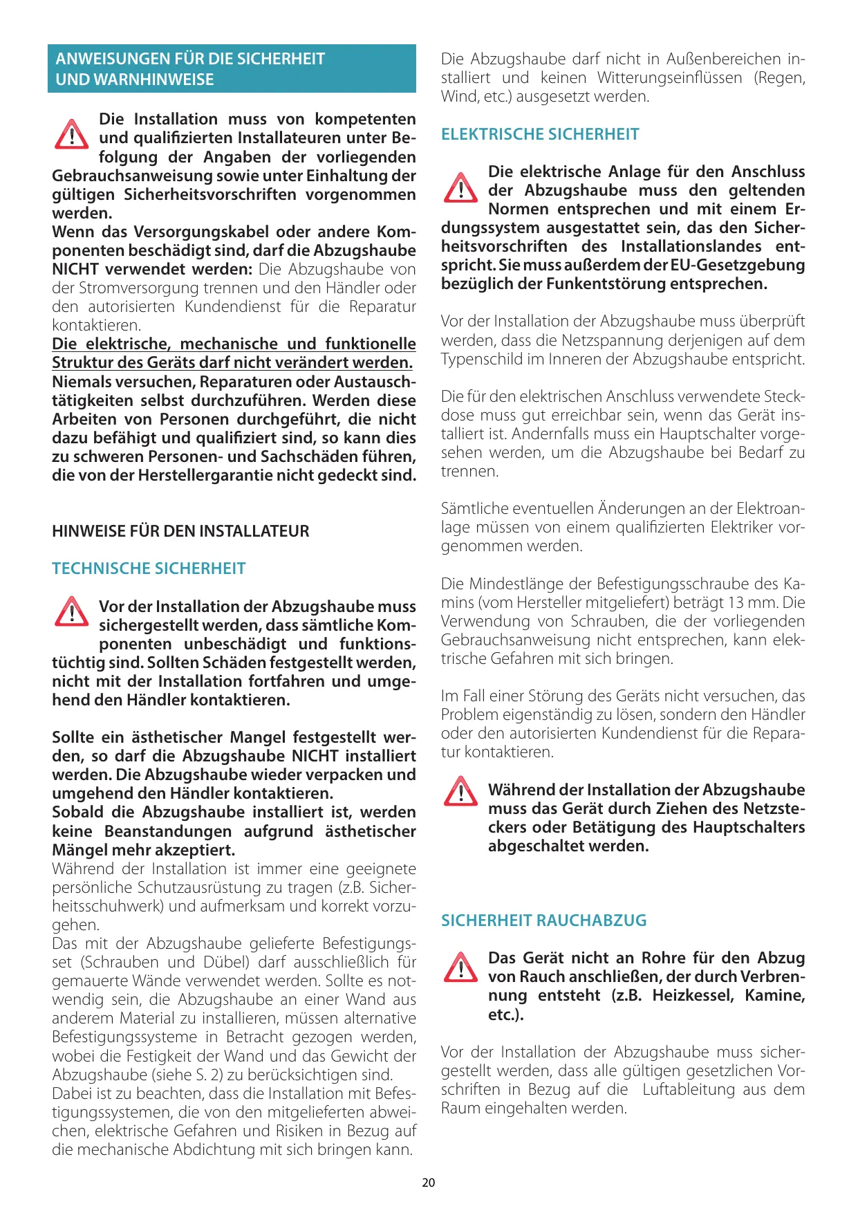 TECHNISCHE SICHERHEIT Die Mindestlänge der Befestigungsschraube des Kamins (vom Hersteller mitgeliefert) beträgt 13 mm. Die Verwendung von Schrauben, die der vorliegenden Gebrauchsanweisung nicht entsprechen, kann elektrische Gefahren mit sich bringen. Vor der Installation der Abzugshaube muss sichergestellt werden, dass sämtliche Komponenten unbeschädigt und funktionstüchtig sind. Sollten Schäden festgestellt werden, nicht mit der Installation fortfahren und umgehend den Händler kontaktieren. Im Fall einer Störung des Geräts nicht versuchen, das Problem eigenständig zu lösen, sondern den Händler oder den autorisierten Kundendienst für die Reparatur kontaktieren. Sollte ein ästhetischer Mangel festgestellt werden, so darf die Abzugshaube NICHT installiert werden. Die Abzugshaube wieder verpacken und umgehend den Händler kontaktieren. Sobald die Abzugshaube installiert ist, werden keine Beanstandungen aufgrund ästhetischer Mängel mehr akzeptiert. Während der Installation ist immer eine geeignete persönliche Schutzausrüstung zu tragen (z.B. Sicherheitsschuhwerk) und aufmerksam und korrekt vorzugehen. Das mit der Abzugshaube gelieferte Befestigungsset (Schrauben und Dübel) darf ausschließlich für gemauerte Wände verwendet werden. Sollte es notwendig sein, die Abzugshaube an einer Wand aus anderem Material zu installieren, müssen alternative Befestigungssysteme in Betracht gezogen werden, wobei die Festigkeit der Wand und das Gewicht der Abzugshaube (siehe S. 2) zu berücksichtigen sind. Dabei ist zu beachten, dass die Installation mit Befestigungssystemen, die von den mitgelieferten abweichen, elektrische Gefahren und Risiken in Bezug auf die mechanische Abdichtung mit sich bringen kann. Während der Installation der Abzugshaube muss das Gerät durch Ziehen des Netzsteckers oder Betätigung des Hauptschalters abgeschaltet werden. SICHERHEIT RAUCHABZUG Das Gerät nicht an Rohre für den Abzug von Rauch anschließen, der durch Verbrennung entsteht (z.B. Heizkessel, Kamine, etc.). Vor der Installation der Abzugshaube muss sichergestellt werden, dass alle gültigen gesetzlichen Vorschriften in Bezug auf die Luftableitung aus dem Raum eingehalten werden.