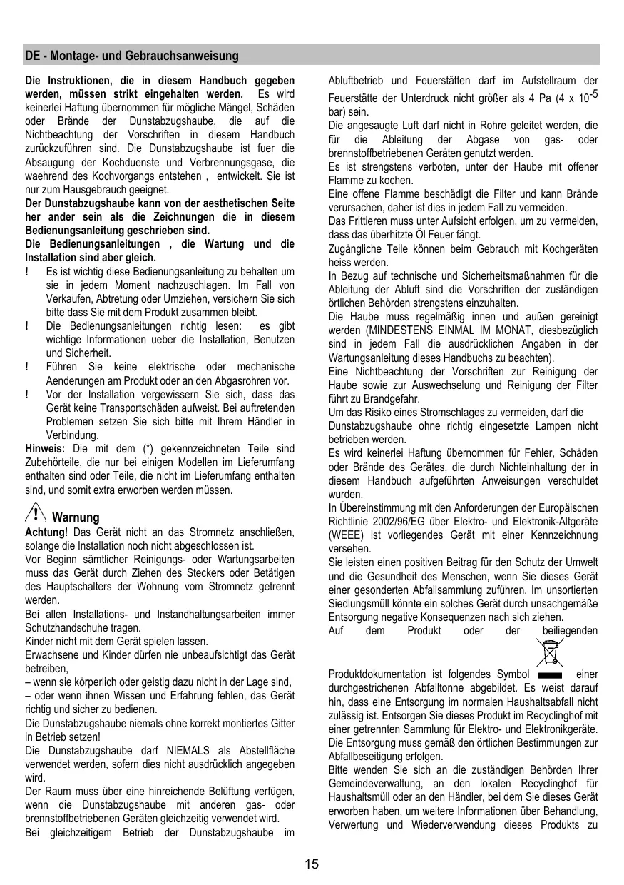 éviter à tout prix. La friture d’aliments doit être réalisée sous contrôle pour éviter que l’huile surchauffée ne prenne feu. Les pièces accessibles peuvent se réchauffer de façon importante quand elles sont utilisées avec des appareils pour la cuisson. En ce qui concerne les mesures techniques et de sécurité à adopter pour l’évacuation des fumées, s’en tenir strictement à ce qui est prévu dans les règlements des autorités locales compétentes. La hotte doit être régulièrement nettoyée, aussi bien à l’intérieur qu’à l’extérieur (AU MOINS UNE FOIS PAR MOIS, respecter néanmoins les instructions relatives à l’entretien fournies dans ce manuel). La non observation de ces normes de nettoyage de la hotte et du changement et nettoyage des filtres comporte des risques d’incendie. Ne pas utiliser ou laisser la hotte sans que les ampoules soient correctement placées pour éviter tout risque de choc électrique. La société décline toute responsabilité pour d’éventuels inconvénients, dégâts ou incendies provoqués par l’appareil et dérivés de la non observation des instructions reprises dans ce manuel. Cet appareil porte le symbole du recyclage conformément à la Directive Européenne 2002/96/CE concernant les Déchets d’Équipements Électriques et Électroniques (DEEE ou WEEE). En procédant correctement à la mise au rebut de cet appareil, vous contribuerez à empêcher toute conséquence nuisible pour l’environnement et la santé de l’homme.