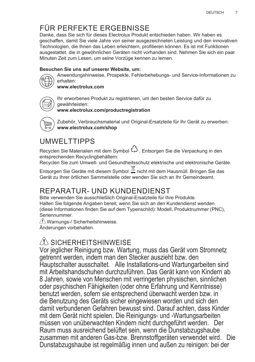 Danke, dass Sie sich für dieses Electrolux Produkt entschieden haben. Wir haben es geschaffen, damit Sie viele Jahre von seiner ausgezeichneten Leistung und den innovativen Technologien, die Ihnen das Leben erleichtern, profitieren können. Es ist mit Funktionen ausgestattet, die in gewöhnlichen Geräten nicht vorhanden sind. Nehmen Sie sich ein paar Minuten Zeit zum Lesen, um seine Vorzüge kennen zu lernen. Besuchen Sie uns auf unserer Website, um: Anwendungshinweise, Prospekte, Fehlerbehebungs- und Service-Informationen zu erhalten: www.electrolux.com Ihr erworbenes Produkt zu registrieren, um den besten Service dafür zu gewährleisten: www.electrolux.com/productregistration Zubehör, Verbrauchsmaterial und Original-Ersatzteile für Ihr Gerät zu erwerben: www.electrolux.com/shop UMWELTTIPPS Recyclen Sie Materialien mit dem Symbol . Entsorgen Sie die Verpackung in den entsprechenden Recyclingbehältern. Recyclen Sie zum Umwelt- und Gesundheitsschutz elektrische und elektronische Geräte. Entsorgen Sie Geräte mit diesem Symbol nicht mit dem Hausmüll. Bringen Sie das Gerät zu Ihrer örtlichen Sammelstelle oder wenden Sie sich an Ihr Gemeindeamt.
