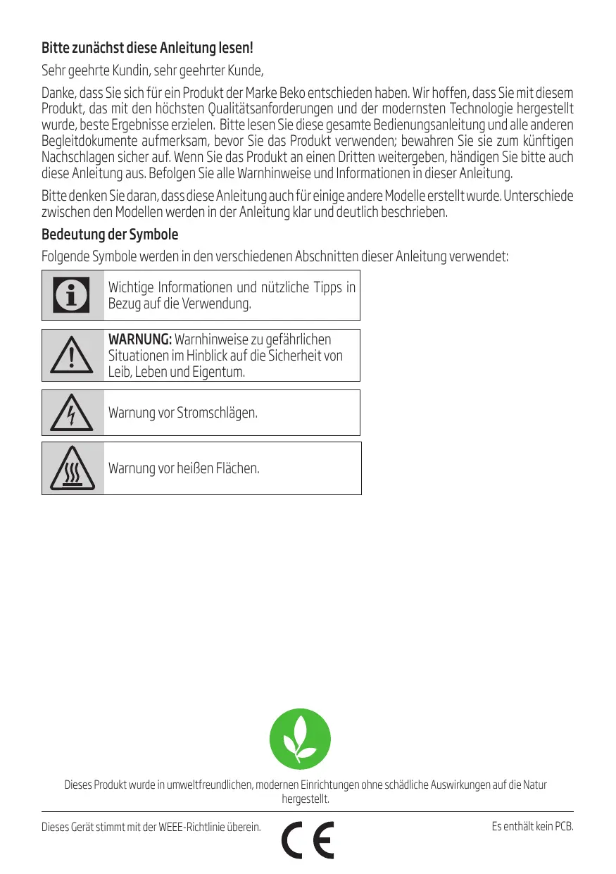 Bitte zunächst diese Anleitung lesen! Sehr geehrte Kundin, sehr geehrter Kunde, Danke, dass Sie sich für ein Produkt der Marke Beko entschieden haben. Wir hoffen, dass Sie mit diesem Produkt, das mit den höchsten Qualitätsanforderungen und der modernsten Technologie hergestellt wurde, beste Ergebnisse erzielen. Bitte lesen Sie diese gesamte Bedienungsanleitung und alle anderen Begleitdokumente aufmerksam, bevor Sie das Produkt verwenden; bewahren Sie sie zum künftigen Nachschlagen sicher auf. Wenn Sie das Produkt an einen Dritten weitergeben, händigen Sie bitte auch diese Anleitung aus. Befolgen Sie alle Warnhinweise und Informationen in dieser Anleitung. Bitte denken Sie daran, dass diese Anleitung auch für einige andere Modelle erstellt wurde. Unterschiede zwischen den Modellen werden in der Anleitung klar und deutlich beschrieben. Bedeutung der Symbole Folgende Symbole werden in den verschiedenen Abschnitten dieser Anleitung verwendet: