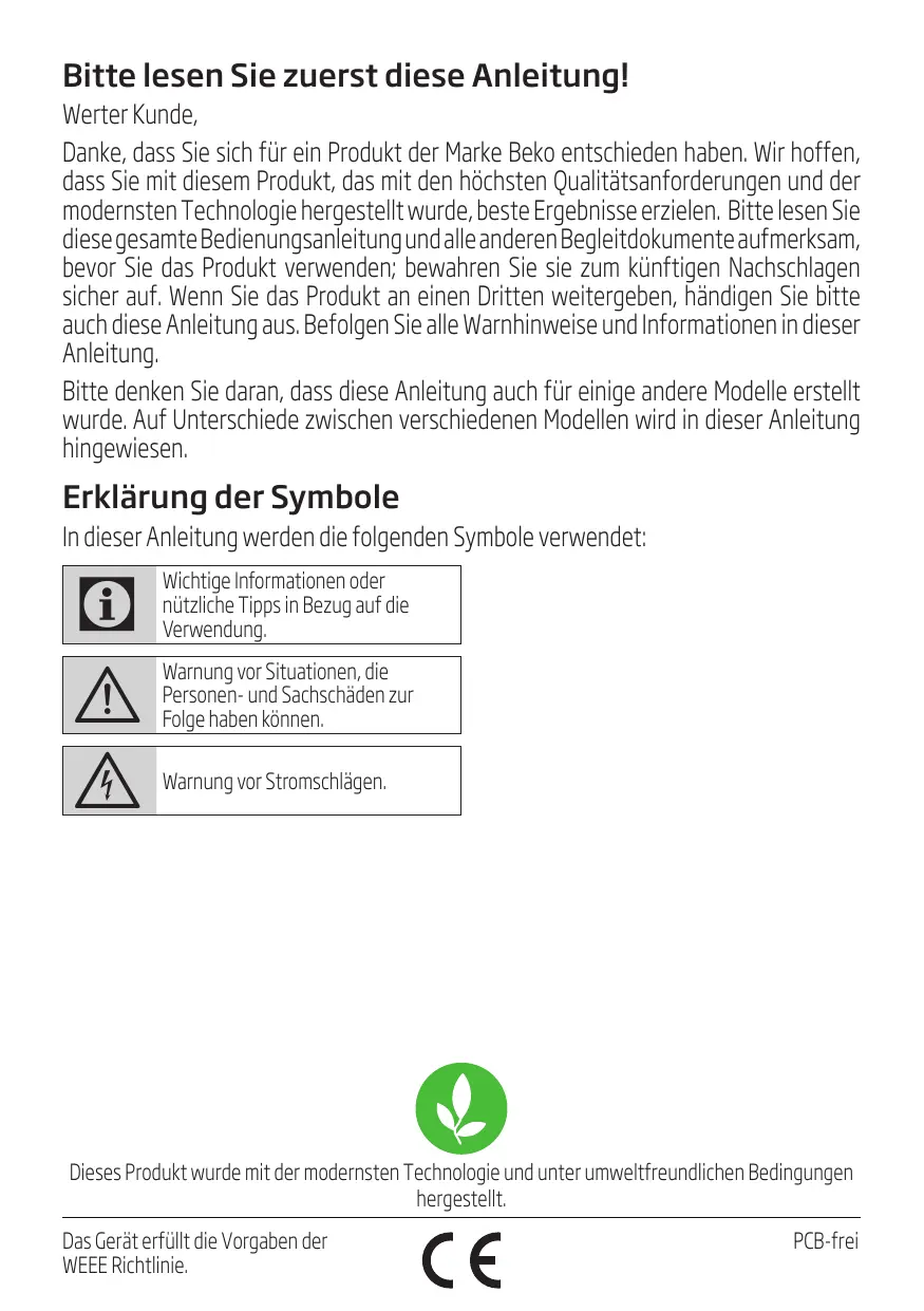 Danke, dass Sie sich für ein Produkt der Marke Beko entschieden haben. Wir hoffen, dass Sie mit diesen Produkt, das mit den höchsten Qualitätsanforderungen und der modernsten Technologie hergestellt wurde, Beste Ergebnisse erzielen.itte lessen Sie diese gesamte Bedienungsanleitung und alle anderen Begleitdokumente aufmerksam, bevor Sie das Produkt verwenden; bewahren Sie sie zum künftigen Nachschlagen sicher auf. Wenn Sie das Produkt an einen Dritten weitergeben, handigen Sieitte auch diese Anleitung aus. Befolgen Sie alle Warnhinweise und Informationen in dieser Anleitung.