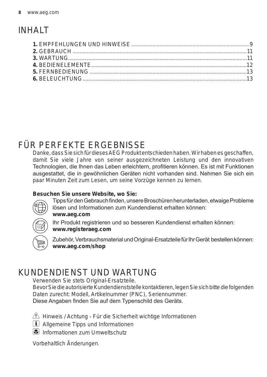 Danke, dass Sie sich für dieses AEG Produkt entschieden haben. Wir haben es geschaffen, damit Sie viele Jahre von seiner ausgezeichneten Leistung und den innovativen 7HFKQRORJLHQGLH,KQHQGDV/HEHQHUOHLFKWHUQSUR¿WLHUHQN|QQHQ(VLVWPLW)XQNWLRQHQ DXVJHVWDWWHWGLHLQJHZ|KQOLFKHQ*HUlWHQQLFKWYRUKDQGHQVLQG1HKPHQ6LHVLFKHLQ paar Minuten Zeit zum Lesen, um seine Vorzüge kennen zu lernen. Besuchen Sie unsere Website, wo Sie: 7LSSVIUGHQ*HEUDXFK¿QGHQXQVHUH%URVFKUHQKHUXQWHUODGHQHWZDLJH3UREOHPH