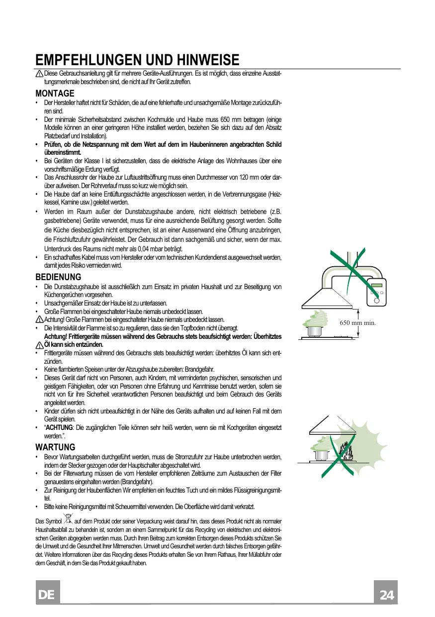 INHALTSVERZEICHNIS DE EMPFEHLUNGEN UND HINWEISE 24 CHARAKTERISTIKEN 25 MONTAGE 26 BEDIENUNG 29 WARTUNG 30