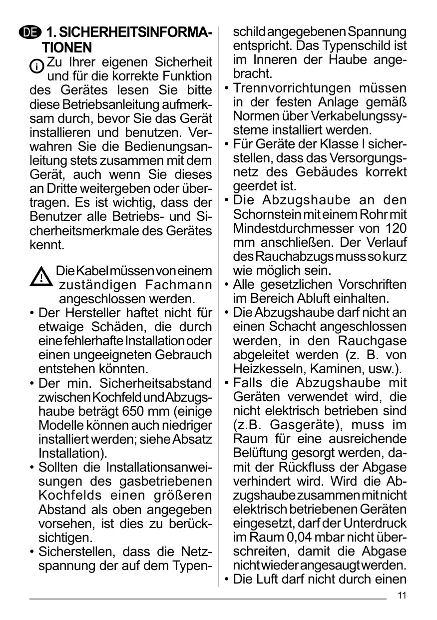 • Pour les appareils de Classe I, s’assurer que l’installation électrique de votre intérieur dispose d’une mise à la terre adéquate. Reliez l’aspirateur du conduit de cheminée avec un tube ayant un diamètre minimum de 120 mm. Le parcours des fumées doit être le plus court possible. Respecter toutes les normes concernant l’évacuation de l’air. Ne reliez pas la hotte aspirante aux conduits de cheminée qui acheminent les fumées de combustion (par ex. de chaudières, de cheminées, etc.). Si vous utilisez l’aspirateur en même temps que des appareils non électriques (par ex. fonctionnant au gaz), veillez à ce que la pièce soit adéquatement ventilée, afin d’empêcher le retour du flux des gaz d’évacuation. Si vous utilisez la hotte de cuisine en même temps que des appareils non alimentés à l’électricité, la pression négative dans la pièce ne doit pas dépasser 0,04 mbar, afin d’éviter que les fumées soient réaspirées dans la pièce où se trouve la hotte. Ne pas évacuer l’air à travers 15