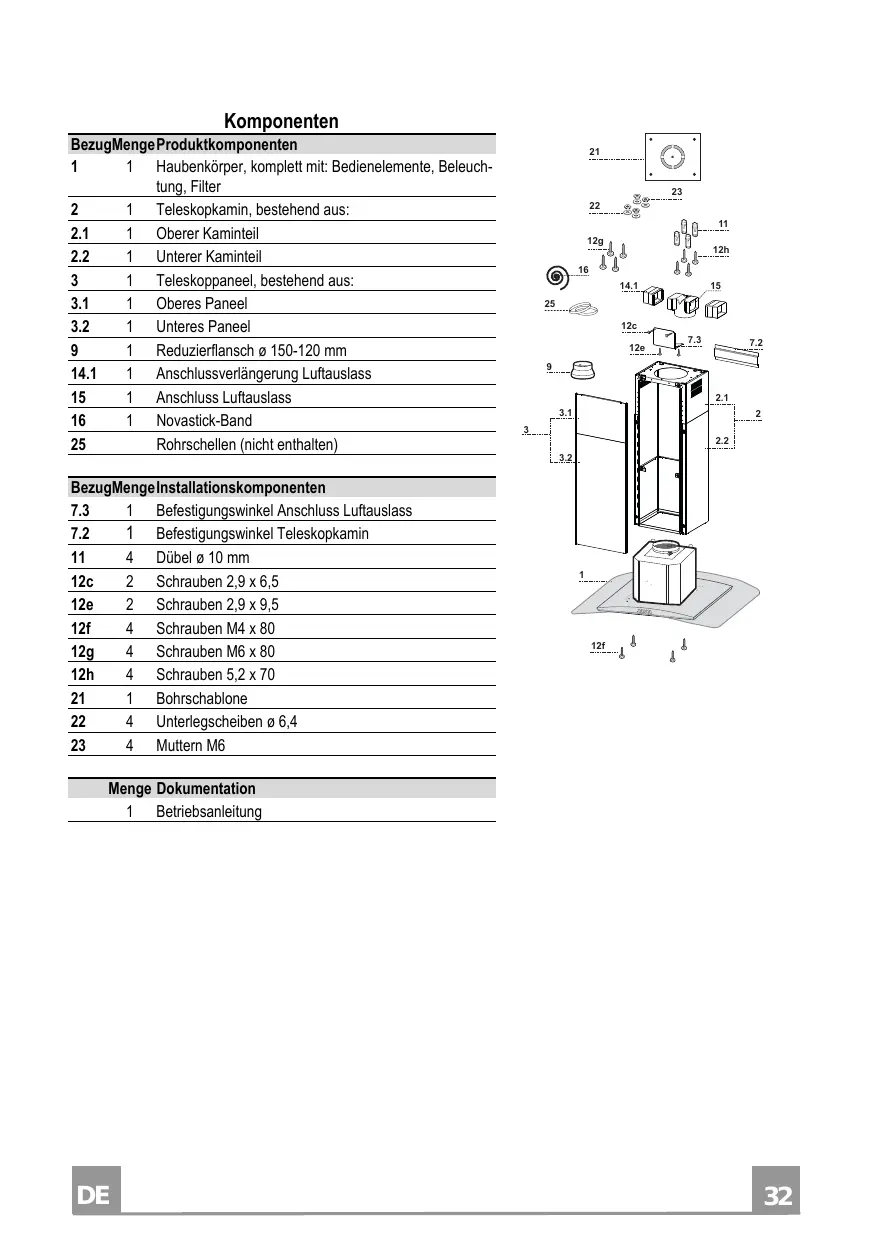 Komponenten BezugMenge Produktkomponenten 1 1 Haubenkörper, komplett mit: Bedienelemente, Beleuchtung, Filter 2 1 Teleskopkamin, bestehend aus: 2.1 1 Oberer Kaminteil 2.2 1 Unterer Kaminteil 3 1 Teleskoppaneel, bestehend aus: 3.1 1 Oberes Paneel 3.2 1 Unteres Paneel 9 1 Reduzierflansch ø 150-120 mm 14.1 1 Anschlussverlängerung Luftauslass 15 1 Anschluss Luftauslass 16 1 Novastick-Band 25 Rohrschellen (nicht enthalten) BezugMenge Installationskomponenten 7.3 1 Befestigungswinkel Anschluss Luftauslass 7.2 1 Befestigungswinkel Teleskopkamin 11 4 Dübel ø 10 mm 12c 2 Schrauben 2,9 x 6,5 12e 2 Schrauben 2,9 x 9,5 12f 4 Schrauben M4 x 80 12g 4 Schrauben M6 x 80 12h 4 Schrauben 5,2 x 70 21 1 Bohrschablone 22 4 Unterlegscheiben ø 6,4 23 4 Muttern M6