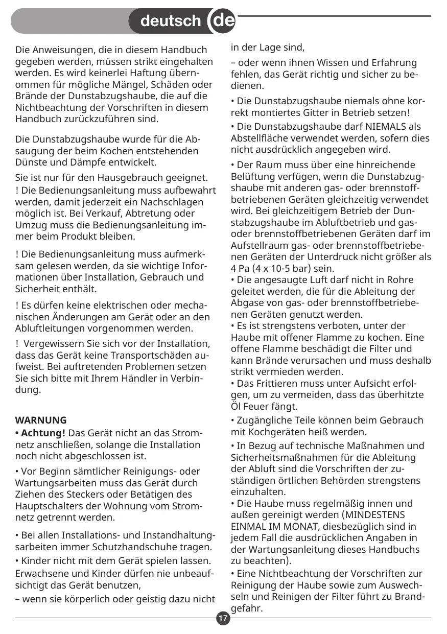 Die Dunstabzugshaube wurde für die Absaugung der beim Kochen entstehenden Dünste und Dämpfe entwickelt. Sie ist nur für den Hausgebrauch geeignet. ! Die Bedienungsanleitung muss aufbewahrt werden, damit jederzeit ein Nachschlagen möglich ist. Bei Verkauf, Abtretung oder Umzug muss die Bedienungsanleitung immer beim Produkt bleiben. ! Die Bedienungsanleitung muss aufmerksam gelesen werden, da sie wichtige Informationen über Installation, Gebrauch und Sicherheit enthält. ! Es dürfen keine elektrischen oder mechanischen Änderungen am Gerät oder an den Abluftleitungen vorgenommen werden. ! Vergewissern Sie sich vor der Installation, dass das Gerät keine Transportschäden aufweist. Bei auftretenden Problemen setzen Sie sich bitte mit Ihrem Händler in Verbindung. WARNUNG • Achtung! Das Gerät nicht an das Stromnetz anschließen, solange die Installation noch nicht abgeschlossen ist. • Vor Beginn sämtlicher Reinigungs- oder Wartungsarbeiten muss das Gerät durch Ziehen des Steckers oder Betätigen des Hauptschalters der Wohnung vom Stromnetz getrennt werden. • Bei allen Installations- und Instandhaltungsarbeiten immer Schutzhandschuhe tragen. • Kinder nicht mit dem Gerät spielen lassen. Erwachsene und Kinder dürfen nie unbeaufsichtigt das Gerät benutzen, – wenn sie körperlich oder geistig dazu nicht 17