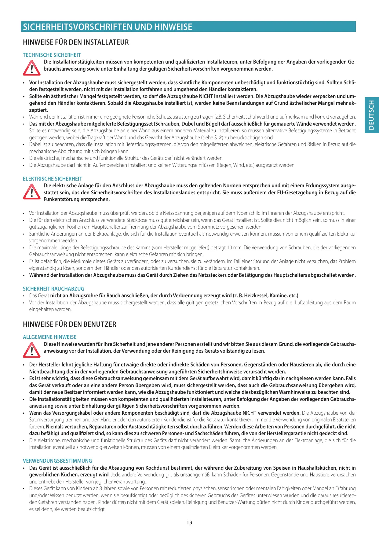 Avant d’efectuer l'installation de la hotte, lire attentivement le chap. « Instructions de sécurité et mises en garde » à la page 24.