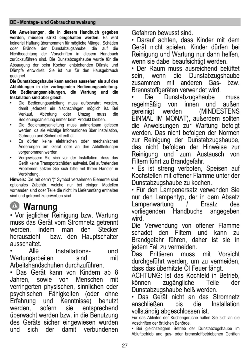 - Das Gerät kann von Kindern ab 8 Jahren, sowie von Menschen mit verringerten physischen, sinnlichen oder psychischen Fähigkeiten (oder ohne Erfahrung und Kenntnisse) benutzt werden, sofern sie entsprechend überwacht werden bzw. in die Benutzung des Geräts sicher eingewiesen wurden und sich der damit verbundenen Für das Ableiten der Küchengerüche halten Sie sich an die Voschriften der örtlichen Behörde.