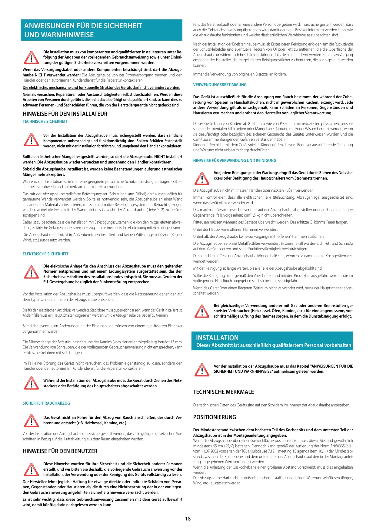 Wenn das Versorgungskabel oder andere Komponenten beschädigt sind, darf die Abzugs- haube NICHT verwendet werden: Die Abzugshaube van der Stromversorgung trennen und den Händler oder den autorisierten Kundendienst für die Reparatur kontaktieren. Die Installation muss von kompetenten und qualifizierten Installateuren unter Be- folgung der Angaben der vorliegenden Gebrauchsanweisung sowie unter Einhal- tung der gültigen Sicherheitsvorschriften vorgenommen werden. Die elektrische, mechanische und funktionelle Struktur des Geräts darf nicht verändert werden, Niemals versuchen, Reparaturen oder Austauschtätigkeiten selbst durchzuführen. Werden diese Arbeiten von Personen durchgeführ, die nicht dazu befähigt und qualifziert sind, so kann dies zu schweren Personen- und Sachschäden führen, die von der Herstellergarantie nicht gedeckt sind.