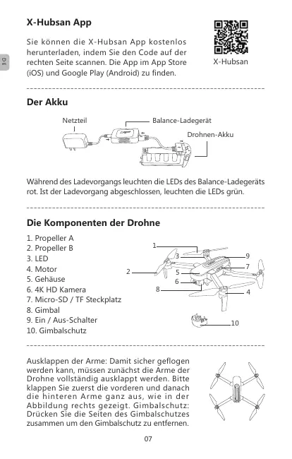 X-Hubsan App Sie können die X-Hubsan App kostenlos herunterladen, indem Sie den Code auf der rechten Seite scannen. Die App im App Store (iOS) und Google Play (Android) zu finden. X-Hubsan Der Akku Netzteil Balance-Ladegerät Drohnen-Akku Während des Ladevorgangs leuchten die LEDs des Balance-Ladegeräts rot. Ist der Ladevorgang abgeschlossen, leuchten die LEDs grün. Die Komponenten der Drohne