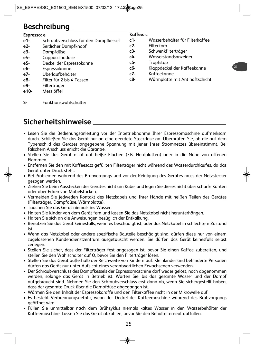 SE_ESPRESSO_EX1500_SEB EX1500 07/02/12 17:13 Page25 Beschreibung Espresso: e e1Schraubverschluss für den Dampfkessel e2Seitlicher Dampfknopf e3Dampfdüse e4Cappuccinodüse e5Deckel der Espressokanne e6Espressokanne e7Überlaufbehälter e8Filter für 2 bis 4 Tassen e9Filterträger e10Messlöffel