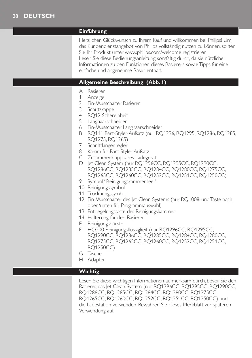 Rasierer Anzeige Ein-/Ausschalter Rasierer Schutzkappe RQ12 Schereinheit Langhaarschneider Ein-/Ausschalter Langhaarschneider RQ111 Bart-Styler-Aufsatz (nur RQ1296, RQ1295, RQ1286, RQ1285, RQ1275, RQ1265) Schnittlängenregler Kamm für Bart-Styler-Aufsatz Zusammenklappbares Ladegerät Jet Clean System (nur RQ1296CC, RQ1295CC, RQ1290CC, RQ1286CC, RQ1285CC, RQ1284CC, RQ1280CC, RQ1275CC, RQ1265CC, RQ1260CC, RQ1252CC, RQ1251CC, RQ1250CC) Symbol “Reinigungskammer leer” Reinigungssymbol Trocknungssymbol Ein-/Ausschalter des Jet Clean Systems (nur RQ1008: und Taste nach oben/unten für Programmauswahl) Entriegelungstaste der Reinigungskammer Halterung für den Rasierer Reinigungsbürste HQ200 Reinigungsflüssigkeit (nur RQ1296CC, RQ1295CC, RQ1290CC, RQ1286CC, RQ1285CC, RQ1284CC, RQ1280CC, RQ1275CC, RQ1265CC, RQ1260CC, RQ1252CC, RQ1251CC, RQ1250CC) Tasche Adapter Wichtig Lesen Sie diese wichtigen Informationen aufmerksam durch, bevor Sie den Rasierer, das Jet Clean System (nur RQ1296CC, RQ1295CC, RQ1290CC, RQ1286CC, RQ1285CC, RQ1284CC, RQ1280CC, RQ1275CC, RQ1265CC, RQ1260CC, RQ1252CC, RQ1251CC, RQ1250CC) und die Ladestation verwenden. Bewahren Sie dieses Merkblatt zur späteren Verwendung auf. DEUTSCH