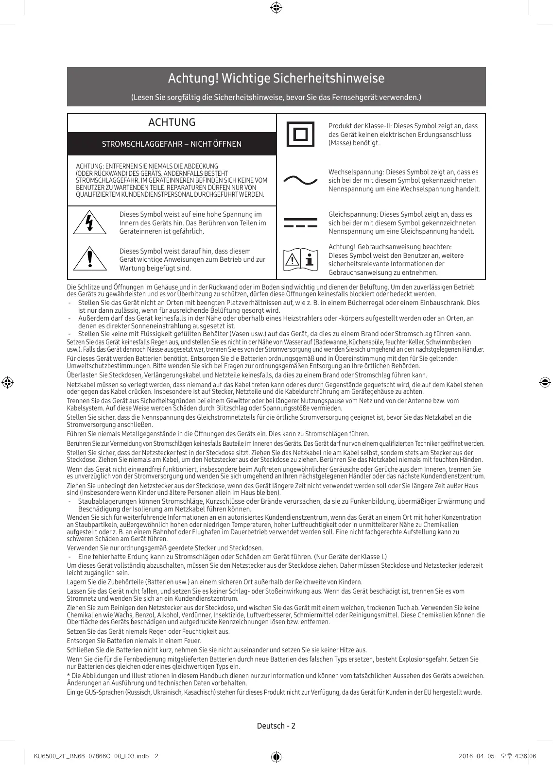 Programmieren Sie die Fernbedienung des Kabel-/Satellitenreceivers so, dass sie das Fernsehgerät anspricht. Den Code für Samsung-Fernsehgerät finden Sie in der Bedienungsanleitung Ihres Kabel-/Satellitenreceivers. Deutsch - 8 KU6500_ZF_BN68-07866C-00_L03.indb 8 2016-04-05 오후 4:36:10 Die Einstellungen des Fernsehgeräts gehen nach 5 Minuten verloren.