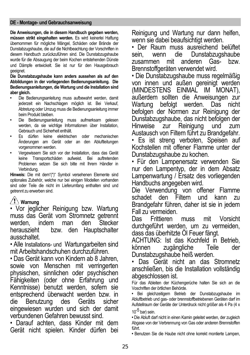 • L’air ne doit pas être envoyé dans un conduit utilisé pour évacuer les fumées d’appareils utilisant du gaz ou un autre combustible. • Ne pas utiliser ou laisser la hotte sans les lampes correctement montées, car un éventuel risque de choc électrique est possible. • N’utilisez jamais la hotte sans la grille montée correctement! • La hotte ne doit JAMAIS être utilisée comme une surface d'appui, sauf indication expresse.