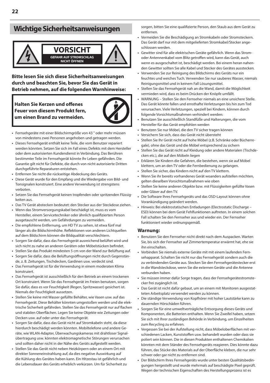 • N'utilisez pas de télévision directement après déballage. Attendez que la télévision se réchauffe à la température ambiante avant de l'utiliser. • Ne jamais relier un dispositif externe à un appareil sous tension. Éteindre non seulement la TV mais également les dispositifs qui lui sont reliés! Relier la fiche de la TV à la prise murale après avoir relié tous les dispositifs externes et l'antenne! • Assurer toujours le libre accès à la fiche secteur de la TV. • L'appareil n'est pas conçu pour un usage dans un lieu de travail équipé de moniteurs. • L'utilisation systématique des écouteurs à un niveau de volume élevé peut conduire à des dommages irréversibles de l'audition. • Assurer l'élimination de cet appareil et de tous les composants y compris les batteries, en conformité avec les normes environnementales. Dans le doute, entrer en contact avec l'autorité locale pour les détails concernant le recyclage. • Tout en installant l'appareil, se souvenir que les surfaces des meubles sont traitées avec divers vernis, plastiques, etc. ou qu'elles peuvent être cirées. Les produits chimiques contenus dans ces produits peuvent avoir une réaction avec le support de la TV. Ceci pourrait faire que des morceaux de matériaux collent à la surface des meubles, qu'il sera difficile d'enlever, voire impossible. • L'écran de la TV a été fabriqué selon des conditions de qualité supérieure et a été examiné en détail plusieurs fois, pour déceler les pixels défectueux. En raison des propriétés technologiques du processus de fabrication, il n'est pas possible d'éliminer l'existence d'un nombre restreint de points défectueux sur l'écran (même avec soin extrême, au cours de