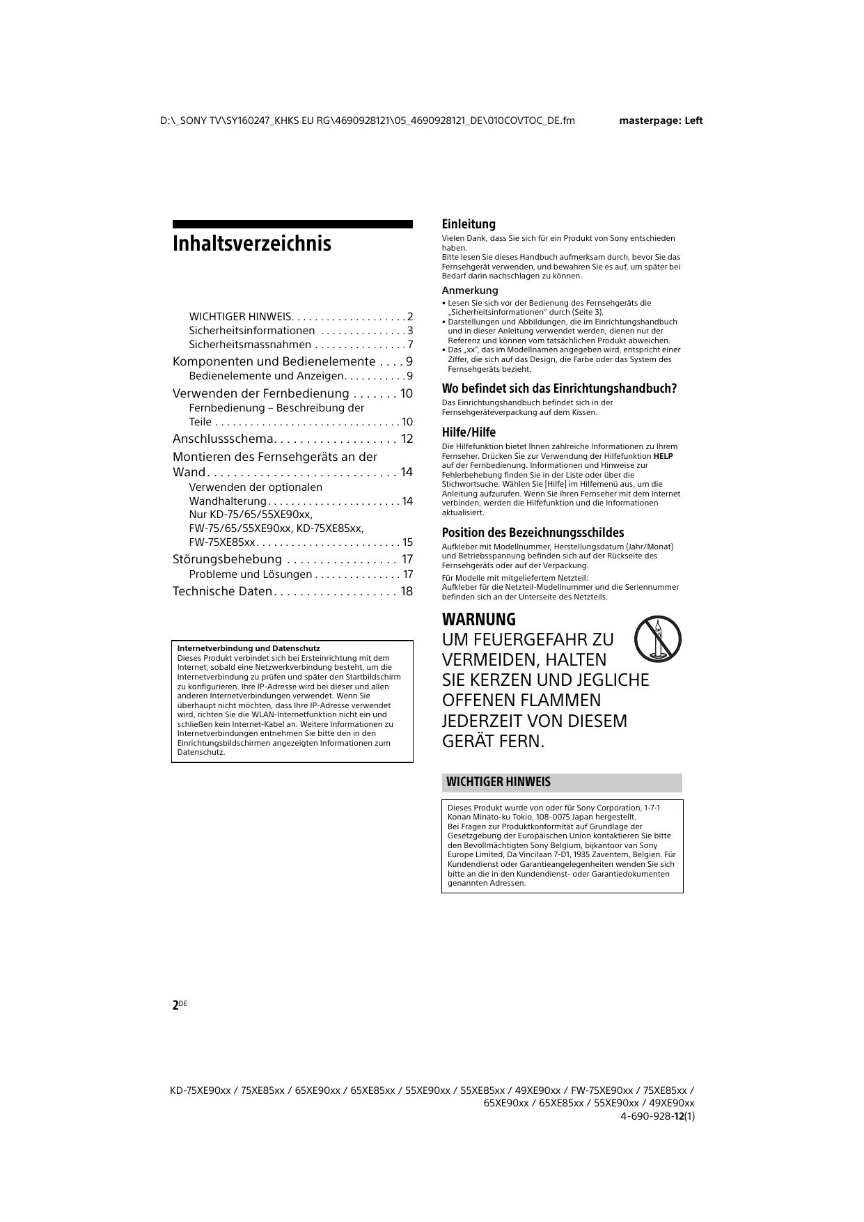 - Het USB-IF SuperSpeed USB-drietandlogo is een gedeponeerd handelsmerk van USB Implementers Forum, Inc. 20NL KD-75XE90xx / 75XE85xx / 65XE90xx / 65XE85xx / 55XE90xx / 55XE85xx / 49XE90xx / FW-75XE90xx / 75XE85xx / 65XE90xx / 65XE85xx / 55XE90xx / 49XE90xx 4-690-928-12(1) D:\_SONY TV\SY160247_KHKS EU RG\4690928121\05_4690928121_DE\010COVTOC_DE.fm masterpage: Left Einleitung Inhaltsverzeichnis Vielen Dank, dass Sie sich für ein Produkt von Sony entschieden haben. Bitte lesen Sie dieses Handbuch aufmerksam durch, bevor Sie das Fernsehgerät verwenden, und bewahren Sie es auf, um später bei Bedarf darin nachschlagen zu können. Anmerkung WICHTIGER HINWEIS. . . . . . . . . . . . . . . . . . . . 2 Sicherheitsinformationen . . . . . . . . . . . . . . . 3 Sicherheitsmassnahmen . . . . . . . . . . . . . . . . 7 Komponenten und Bedienelemente . . . . 9 Bedienelemente und Anzeigen. . . . . . . . . . . 9 Verwenden der Fernbedienung . . . . . . . 10 Fernbedienung – Beschreibung der Teile . . . . . . . . . . . . . . . . . . . . . . . . . . . . . . . . 10 Anschlussschema. . . . . . . . . . . . . . . . . . . 12 Montieren des Fernsehgeräts an der Wand . . . . . . . . . . . . . . . . . . . . . . . . . . . . . 14 Verwenden der optionalen Wandhalterung . . . . . . . . . . . . . . . . . . . . . . . 14 Nur KD-75/65/55XE90xx, FW-75/65/55XE90xx, KD-75XE85xx, FW-75XE85xx . . . . . . . . . . . . . . . . . . . . . . . . . 15 Störungsbehebung . . . . . . . . . . . . . . . . . 17 Probleme und Lösungen . . . . . . . . . . . . . . . 17 Technische Daten. . . . . . . . . . . . . . . . . . . 18 Internetverbindung und Datenschutz Dieses Produkt verbindet sich bei Ersteinrichtung mit dem Internet, sobald eine Netzwerkverbindung besteht, um die Internetverbindung zu prüfen und später den Startbildschirm zu konfigurieren. Ihre IP-Adresse wird bei dieser und allen anderen Internetverbindungen verwendet. Wenn Sie überhaupt nicht möchten, dass Ihre IP-Adresse verwendet wird, richten Sie die WLAN-Internetfunktion nicht ein und schließen kein Internet-Kabel an. Weitere Informationen zu Internetverbindungen entnehmen Sie bitte den in den Einrichtungsbildschirmen angezeigten Informationen zum Datenschutz.