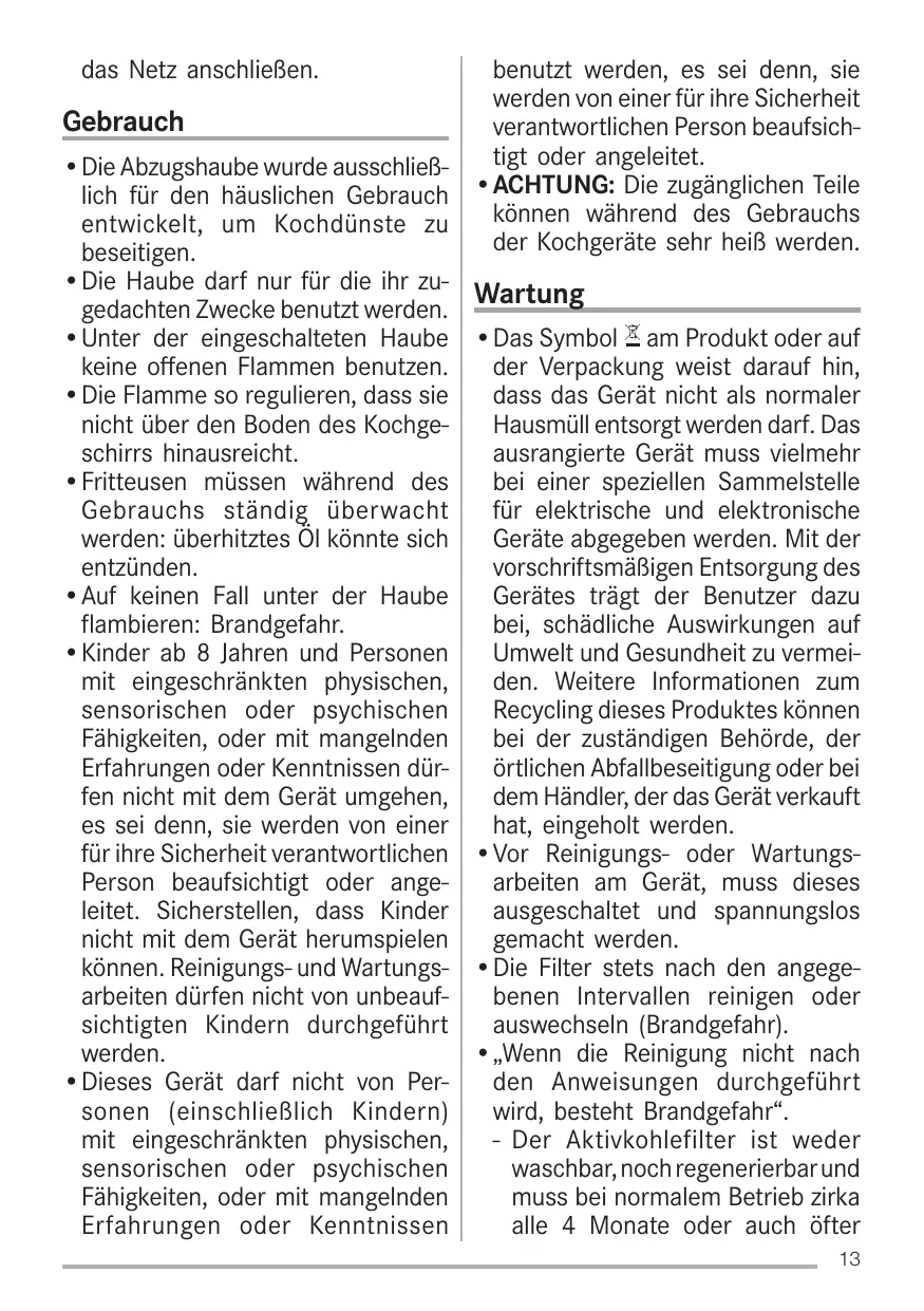 •Avant d’effectuer toute opération de nettoyage et d’entretien, éteindre ou débrancher l’appareil du secteur. •Nettoyer et/ou remplacer les filtres après le délai indiqué (danger d’incendie). •Effectuer le nettoyage selon les instructions, sous risque d’incendie. -- Le filtre à charbon actif ne peut être ni lavé ni régénéré et il doit être remplacé environ tous les 4 mois de fonctionnement ou plus souvent en cas d’utilisation particulièrement intense (W).