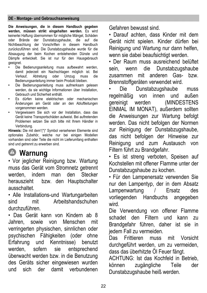 Gefahren bewusst sind. • Darauf achten, dass Kinder mit dem Gerät nicht spielen. Kinder dürfen bei Reinigung und Wartung nur dann helfen, wenn sie dabei beaufsichtigt werden. • Der Raum muss ausreichend belüftet sein, wenn die Dunstabzugshaube zusammen mit anderen Gas- bzw. Brennstoffgeräten verwendet wird. • Die Dunstabzugshaube muss regelmäßig von innen und außen gereinigt werden (MINDESTENS EINMAL IM MONAT), außerdem sollten die Anweisungen zur Wartung befolgt werden. Das nicht befolgen der Normen zur Reinigung der Dunstabzugshaube, das nicht befolgen der Hinweise zur Reinigung und zum Austausch von Filtern führt zu Brandgefahr. • Es ist streng verboten, Speisen auf Kochstellen mit offener Flamme unter der Dunstabzugshaube zu kochen. • Für den Lampenersatz verwenden Sie nur den Lampentyp, der in dem Absatz Lampenwartung / Ersatz des vorliegenden Handbuchs angegeben wird. Die Verwendung von offener Flamme schadet den Filtern und kann zu Brandgefahr führen, daher ist sie in jedem Fall zu vermeiden. Das Frittieren muss mit Vorsicht durchgeführt werden, um zu vermeiden, dass das überhitzte Öl Feuer fängt. ACHTUNG: Ist das Kochfeld in Betrieb, können zugängliche Teile der Dunstabzugshaube heiß werden.