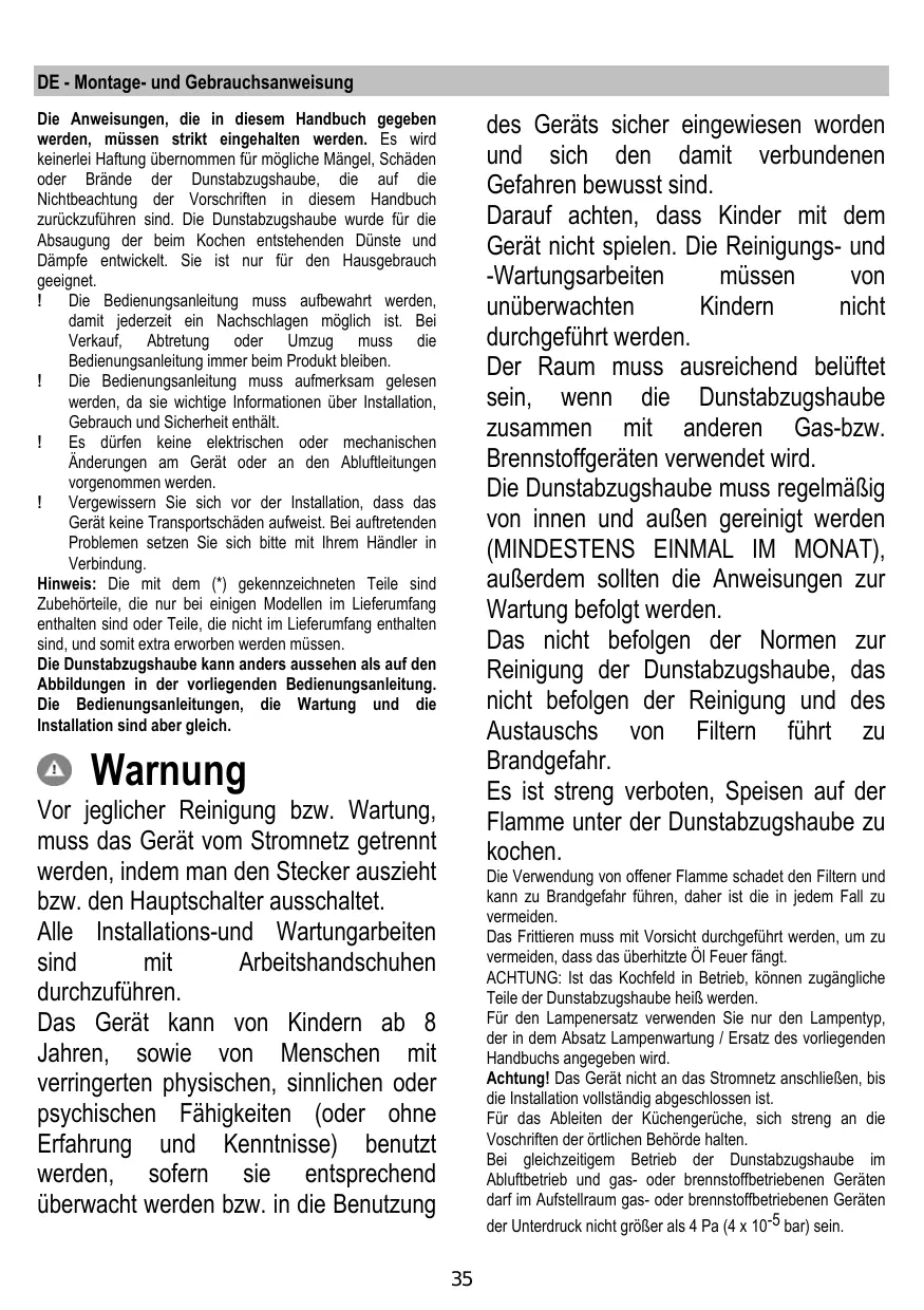 Die Anweisungen, die in thisem Handbuch gegeben werden, müssen strikt eingehalten werden. Es wird keinerlei Haftung übernommen für mögliche Mängel, Schäden oder Brände der Dunstabzugshaube, die auf die Nichtbeachtung der Vorschriften in thisem Handbuch zurückzuführen sind. Die Dunstabzugshaube wurde für die Absaugung der beim Kochen entstehenden Dünste und Dämpfe entwickelt. Sie ist nur für den Hausgebrauch geeignet.