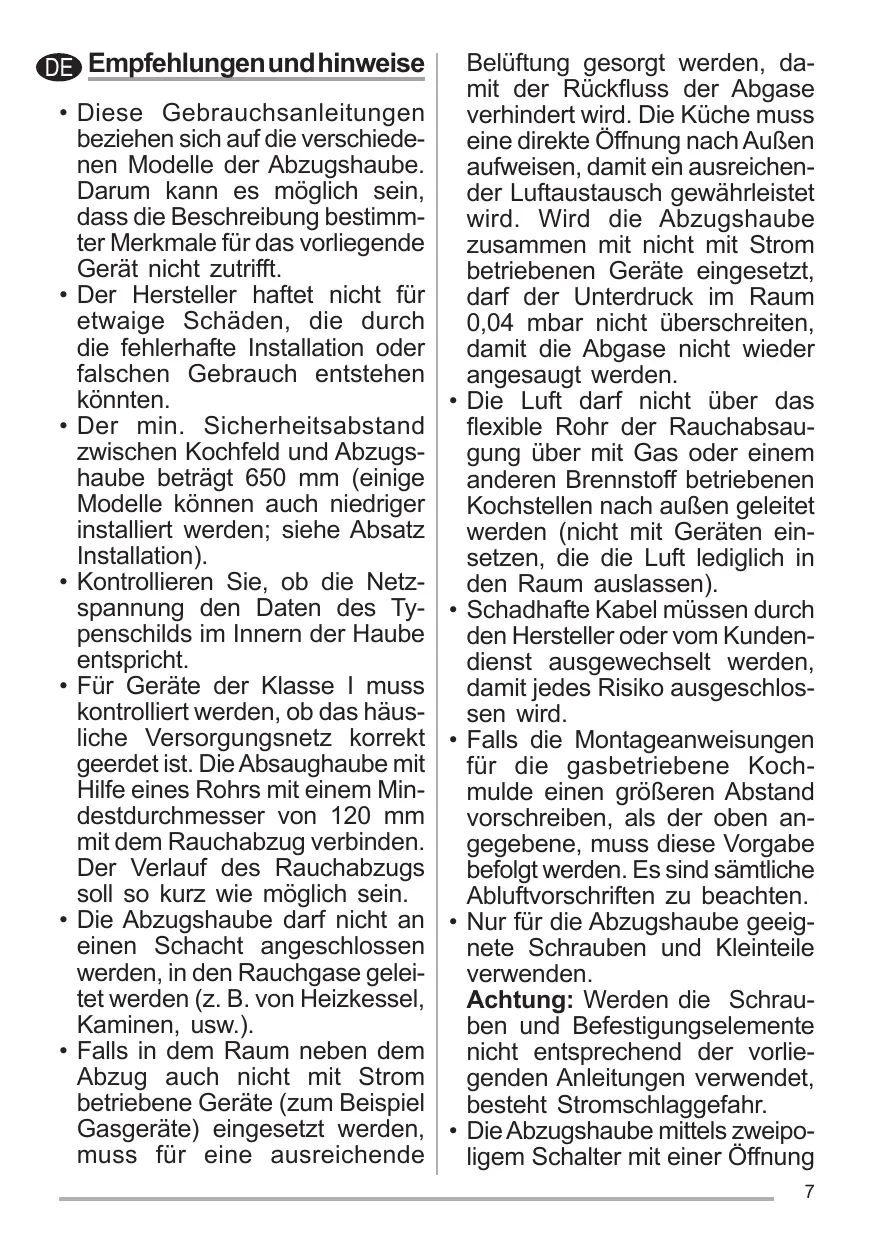 Belüftung gesorgt werden, damit der Rückfluss der Abgase verhindert wird. Die Küche muss eine direkte Öffnung nach Außen aufweisen, damit ein ausreichender Luftaustausch gewährleistet wird. Wird die Abzugshaube zusammen mit nicht mit Strom betriebenen Geräte eingesetzt, darf der Unterdruck im Raum 0,04 mbar nicht überschreiten, damit die Abgase nicht wieder angesaugt werden. Die Luft darf nicht über das flexible Rohr der Rauchabsaugung über mit Gas oder einem anderen Brennstoff betriebenen Kochstellen nach außen geleitet werden (nicht mit Geräten einsetzen, die die Luft lediglich in den Raum auslassen). Schadhafte Kabel müssen durch den Hersteller oder vom Kundendienst ausgewechselt werden, damit jedes Risiko ausgeschlossen wird. Falls die Montageanweisungen für die gasbetriebene Kochmulde einen größeren Abstand vorschreiben, als der oben angegebene, muss diese Vorgabe befolgt werden. Es sind sämtliche Abluftvorschriften zu beachten. Nur für die Abzugshaube geeignete Schrauben und Kleinteile verwenden. Achtung: Werden die Schrauben und Befestigungselemente nicht entsprechend der vorliegenden Anleitungen verwendet, besteht Stromschlaggefahr. Die Abzugshaube mittels zweipoligem Schalter mit einer Öffnung 7