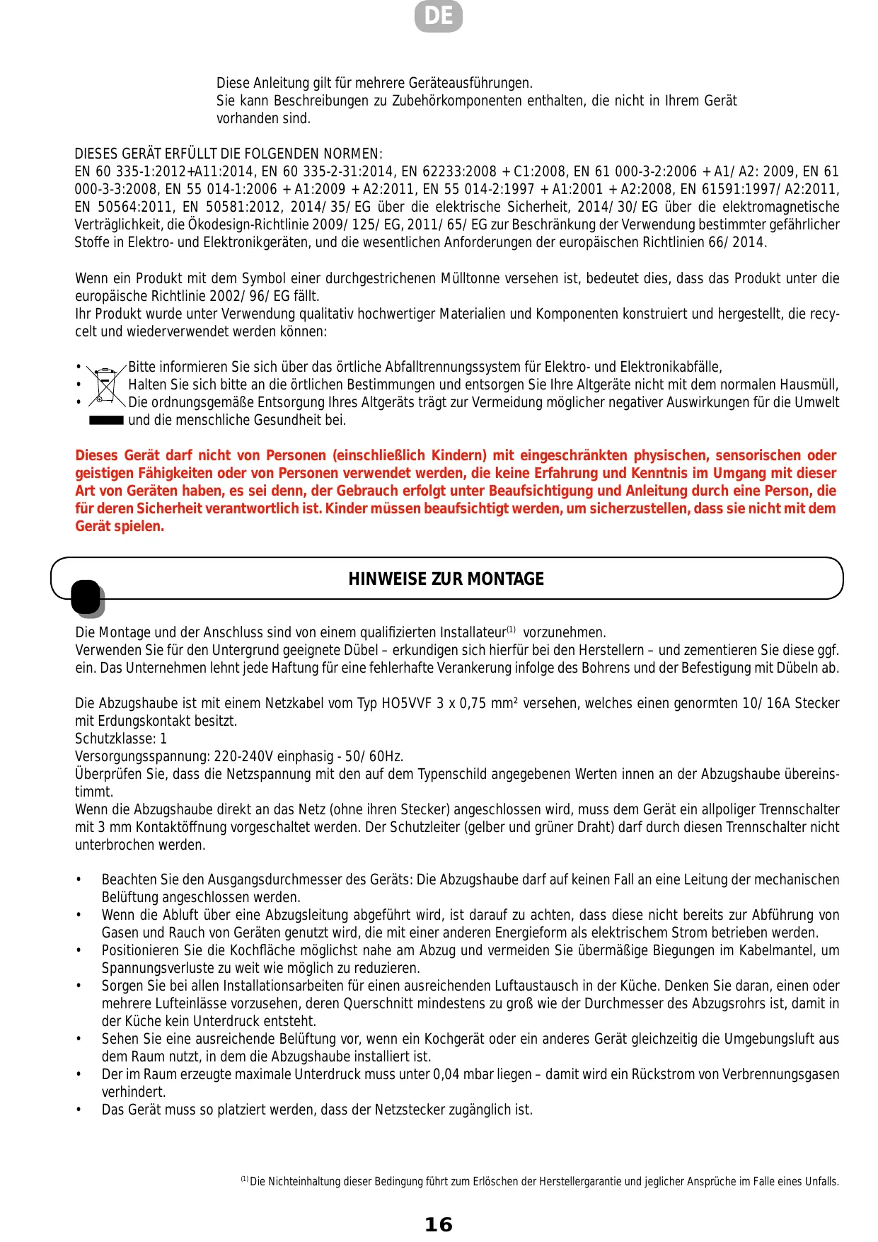 EN 60 335-1:2012+A11:2014, EN 60 335-2-31:2014, EN 62233:2008 + C1:2008, EN 61 000-3-2:2006 + A1/A2: 2009, EN 61 000-3-3:2008, EN 55 014-1:2006 + A1:2009 + A2:2011, EN 55 014-2:1997 + A1:2001 + A2:2008, EN 61591:1997/ A2:2011, EN 50564:2011, EN 50581:2012, 2014/35/CE relative à la sécurité électrique, 2014/30/CE relative à la compatibilité électromagnétique, 2009/125/CE relative à l’écoconception, 2011/65/CE relative à la limitation de l’utilisation de certaines substances dangereuses dans les équipements électriques et électroniques, et aux principales exigences des directives européennes 66/2014. Lorsque le symbole d’une poubelle à roue barrée est attaché à un produit, cela signifie que le produit est couvert par la directive Européenne 2002/96/EC. Votre produit est conçu et fabriqué avec des matériaux et des composants de haute qualité qui peuvent être recyclés et utilisés de nouveau : • • Cet appareil ne doit pas être utilisé par des personnes (y compris les enfants) ayant des capacités psychiques, sensorielles ou mentales réduites, ni par des personnes n’ayant pas l’expérience et la connaissance de ce type d’appareils, à moins d’être sous le contrôle et la formation de personnes responsables de leur sécurité. Les enfants doivent être surveillés pour s’assurer qu’ils ne jouent pas avec l’appareil.