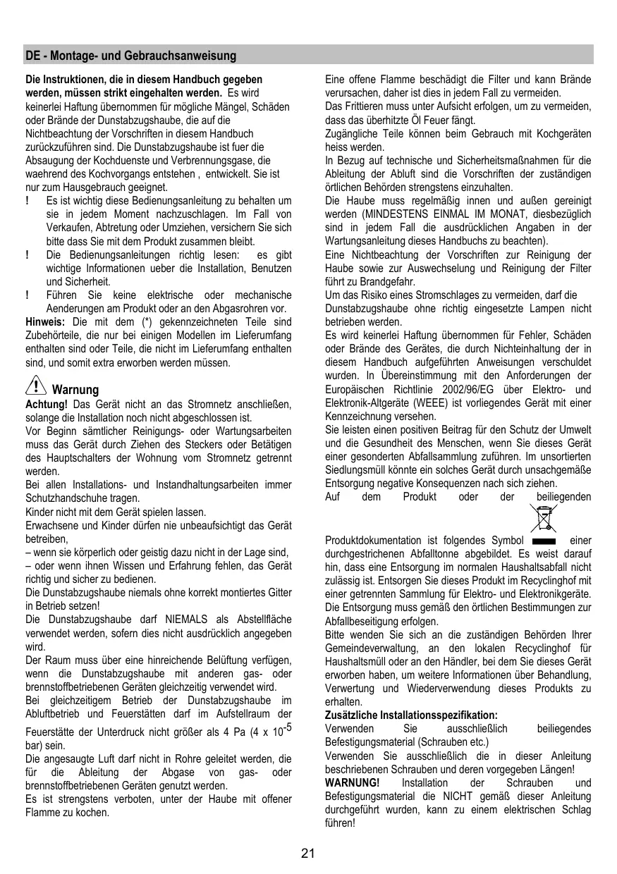 DE - Montage- und Gebrauchsanweisung Eine offene Flamme beschädigt die Filter und kann Brände verursachen, daher ist dies in jedem Fall zu vermeiden. Das Frittieren muss unter Aufsicht erfolgen, um zu vermeiden, dass das überhitzte Öl Feuer fängt. Zugängliche Teile können beim Gebrauch mit Kochgeräten heiss werden. In Bezug auf technische und Sicherheitsmaßnahmen für die Ableitung der Abluft sind die Vorschriften der zuständigen örtlichen Behörden strengstens einzuhalten. Die Haube muss regelmäßig innen und außen gereinigt werden (MINDESTENS EINMAL IM MONAT, diesbezüglich sind in jedem Fall die ausdrücklichen Angaben in der Wartungsanleitung dieses Handbuchs zu beachten). Eine Nichtbeachtung der Vorschriften zur Reinigung der Haube sowie zur Auswechselung und Reinigung der Filter führt zu Brandgefahr. Um das Risiko eines Stromschlages zu vermeiden, darf die Dunstabzugshaube ohne richtig eingesetzte Lampen nicht betrieben werden. Es wird keinerlei Haftung übernommen für Fehler, Schäden oder Brände des Gerätes, die durch Nichteinhaltung der in diesem Handbuch aufgeführten Anweisungen verschuldet wurden. In Übereinstimmung mit den Anforderungen der Europäischen Richtlinie 2002/96/EG über Elektro- und Elektronik-Altgeräte (WEEE) ist vorliegendes Gerät mit einer Kennzeichnung versehen. Sie leisten einen positiven Beitrag für den Schutz der Umwelt und die Gesundheit des Menschen, wenn Sie dieses Gerät einer gesonderten Abfallsammlung zuführen. Im unsortierten Siedlungsmüll könnte ein solches Gerät durch unsachgemäße Entsorgung negative Konsequenzen nach sich ziehen. Auf dem Produkt oder der beiliegenden Die Instruktionen, die in diesem Handbuch gegeben werden, müssen strikt eingehalten werden. Es wird keinerlei Haftung übernommen für mögliche Mängel, Schäden oder Brände der Dunstabzugshaube, die auf die Nichtbeachtung der Vorschriften in diesem Handbuch zurückzuführen sind. Die Dunstabzugshaube ist fuer die Absaugung der Kochduenste und Verbrennungsgase, die waehrend des Kochvorgangs entstehen , entwickelt. Sie ist nur zum Hausgebrauch geeignet. Es ist wichtig diese Bedienungsanleitung zu behalten um sie in jedem Moment nachzuschlagen. Im Fall von Verkaufen, Abtretung oder Umziehen, versichern Sie sich bitte dass Sie mit dem Produkt zusammen bleibt. Die Bedienungsanleitungen richtig lesen: es gibt wichtige Informationen ueber die Installation, Benutzen und Sicherheit. Führen Sie keine elektrische oder mechanische Aenderungen am Produkt oder an den Abgasrohren vor. Hinweis: Die mit dem (*) gekennzeichneten Teile sind Zubehörteile, die nur bei einigen Modellen im Lieferumfang enthalten sind oder Teile, die nicht im Lieferumfang enthalten sind, und somit extra erworben werden müssen. Warnung Achtung! Das Gerät nicht an das Stromnetz anschließen, solange die Installation noch nicht abgeschlossen ist. Vor Beginn sämtlicher Reinigungs- oder Wartungsarbeiten muss das Gerät durch Ziehen des Steckers oder Betätigen des Hauptschalters der Wohnung vom Stromnetz getrennt werden. Bei allen Installations- und Instandhaltungsarbeiten immer Schutzhandschuhe tragen. Kinder nicht mit dem Gerät spielen lassen. Erwachsene und Kinder dürfen nie unbeaufsichtigt das Gerät betreiben, – wenn sie körperlich oder geistig dazu nicht in der Lage sind, – oder wenn ihnen Wissen und Erfahrung fehlen, das Gerät richtig und sicher zu bedienen. Die Dunstabzugshaube niemals ohne korrekt montiertes Gitter in Betrieb setzen! Die Dunstabzugshaube darf NIEMALS als Abstellfläche verwendet werden, sofern dies nicht ausdrücklich angegeben wird. Der Raum muss über eine hinreichende Belüftung verfügen, wenn die Dunstabzugshaube mit anderen gas- oder brennstoffbetriebenen Geräten gleichzeitig verwendet wird. Bei gleichzeitigem Betrieb der Dunstabzugshaube im Abluftbetrieb und Feuerstätten darf im Aufstellraum der Feuerstätte der Unterdruck nicht größer als 4 Pa (4 x 10-5 Produktdokumentation ist folgendes Symbol einer durchgestrichenen Abfalltonne abgebildet. Es weist darauf hin, dass eine Entsorgung im normalen Haushaltsabfall nicht zulässig ist. Entsorgen Sie dieses Produkt im Recyclinghof mit einer getrennten Sammlung für Elektro- und Elektronikgeräte. Die Entsorgung muss gemäß den örtlichen Bestimmungen zur Abfallbeseitigung erfolgen. Bitte wenden Sie sich an die zuständigen Behörden Ihrer Gemeindeverwaltung, an den lokalen Recyclinghof für Haushaltsmüll oder an den Händler, bei dem Sie dieses Gerät erworben haben, um weitere Informationen über Behandlung, Verwertung und Wiederverwendung dieses Produkts zu erhalten. Zusätzliche Installationsspezifikation: Verwenden Sie ausschließlich beiliegendes Befestigungsmaterial (Schrauben etc.) Verwenden Sie ausschließlich die in dieser Anleitung beschriebenen Schrauben und deren vorgegeben Längen! WARNUNG! Installation der Schrauben und Befestigungsmaterial die NICHT gemäß dieser Anleitung durchgeführt wurden, kann zu einem elektrischen Schlag führen! bar) sein. Die angesaugte Luft darf nicht in Rohre geleitet werden, die für die Ableitung der Abgase von gas- oder brennstoffbetriebenen Geräten genutzt werden. Es ist strengstens verboten, unter der Haube mit offener Flamme zu kochen.