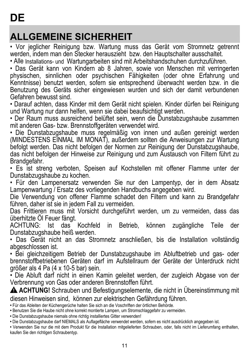 • Vor jeglicher Reinigung bzw. Wartung muss das Gerät vom Stromnetz getrennt werden, indem man den Stecker herauszieht bzw. den Hauptschalter ausschaltet. • Alle Installations- und Wartungarbeiten sind mit Arbeitshandschuhen durchzuführen. • Das Gerät kann von Kindern ab 8 Jahren, sowie von Menschen mit verringerten physischen, sinnlichen oder psychischen Fähigkeiten (oder ohne Erfahrung und Kenntnisse) benutzt werden, sofern sie entsprechend überwacht werden bzw. in die Benutzung des Geräts sicher eingewiesen wurden und sich der damit verbundenen Gefahren bewusst sind. • Darauf achten, dass Kinder mit dem Gerät nicht spielen. Kinder dürfen bei Reinigung und Wartung nur dann helfen, wenn sie dabei beaufsichtigt werden. • Der Raum muss ausreichend belüftet sein, wenn die Dunstabzugshaube zusammen mit anderen Gas- bzw. Brennstoffgeräten verwendet wird. • Die Dunstabzugshaube muss regelmäßig von innen und außen gereinigt werden (MINDESTENS EINMAL IM MONAT), außerdem sollten die Anweisungen zur Wartung befolgt werden. Das nicht befolgen der Normen zur Reinigung der Dunstabzugshaube, das nicht befolgen der Hinweise zur Reinigung und zum Austausch von Filtern führt zu Brandgefahr. • Es ist streng verboten, Speisen auf Kochstellen mit offener Flamme unter der Dunstabzugshaube zu kochen. • Für den Lampenersatz verwenden Sie nur den Lampentyp, der in dem Absatz Lampenwartung / Ersatz des vorliegenden Handbuchs angegeben wird. Die Verwendung von offener Flamme schadet den Filtern und kann zu Brandgefahr führen, daher ist sie in jedem Fall zu vermeiden. Das Frittieren muss mit Vorsicht durchgeführt werden, um zu vermeiden, dass das überhitzte Öl Feuer fängt. ACHTUNG: Ist das Kochfeld in Betrieb, können zugängliche Teile der Dunstabzugshaube heiß werden. • Das Gerät nicht an das Stromnetz anschließen, bis die Installation vollständig abgeschlossen ist. • Bei gleichzeitigem Betrieb der Dunstabzugshaube im Abluftbetrieb und gas- oder brennstoffbetriebenen Geräten darf im Aufstellraum der Geräte der Unterdruck nicht größer als 4 Pa (4 x 10-5 bar) sein. • Die Abluft darf nicht in einen Kamin geleitet werden, der zugleich Abgase von der Verbrennung von Gas oder anderen Brennstoffen führt. ACHTUNG! Schrauben und Befestigungselemente, die nicht in Übereinstimmung mit diesen Hinweisen sind, können zur elektrischen Gefährdung führen.