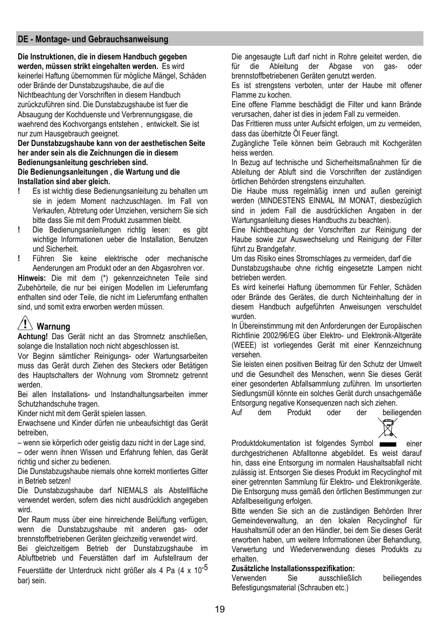 DE - Montage- und Gebrauchsanweisung Die angesaugte Luft darf nicht in Rohre geleitet werden, die für die Ableitung der Abgase von gas- oder brennstoffbetriebenen Geräten genutzt werden. Es ist strengstens verboten, unter der Haube mit offener Flamme zu kochen. Eine offene Flamme beschädigt die Filter und kann Brände verursachen, daher ist dies in jedem Fall zu vermeiden. Das Frittieren muss unter Aufsicht erfolgen, um zu vermeiden, dass das überhitzte Öl Feuer fängt. Zugängliche Teile können beim Gebrauch mit Kochgeräten heiss werden. In Bezug auf technische und Sicherheitsmaßnahmen für die Ableitung der Abluft sind die Vorschriften der zuständigen örtlichen Behörden strengstens einzuhalten. Die Haube muss regelmäßig innen und außen gereinigt werden (MINDESTENS EINMAL IM MONAT, diesbezüglich sind in jedem Fall die ausdrücklichen Angaben in der Wartungsanleitung dieses Handbuchs zu beachten). Eine Nichtbeachtung der Vorschriften zur Reinigung der Haube sowie zur Auswechselung und Reinigung der Filter führt zu Brandgefahr. Um das Risiko eines Stromschlages zu vermeiden, darf die Dunstabzugshaube ohne richtig eingesetzte Lampen nicht betrieben werden. Es wird keinerlei Haftung übernommen für Fehler, Schäden oder Brände des Gerätes, die durch Nichteinhaltung der in diesem Handbuch aufgeführten Anweisungen verschuldet wurden. In Übereinstimmung mit den Anforderungen der Europäischen Richtlinie 2002/96/EG über Elektro- und Elektronik-Altgeräte (WEEE) ist vorliegendes Gerät mit einer Kennzeichnung versehen. Sie leisten einen positiven Beitrag für den Schutz der Umwelt und die Gesundheit des Menschen, wenn Sie dieses Gerät einer gesonderten Abfallsammlung zuführen. Im unsortierten Siedlungsmüll könnte ein solches Gerät durch unsachgemäße Entsorgung negative Konsequenzen nach sich ziehen. Auf dem Produkt oder der beiliegenden Die Instruktionen, die in diesem Handbuch gegeben werden, müssen strikt eingehalten werden. Es wird keinerlei Haftung übernommen für mögliche Mängel, Schäden oder Brände der Dunstabzugshaube, die auf die Nichtbeachtung der Vorschriften in diesem Handbuch zurückzuführen sind. Die Dunstabzugshaube ist fuer die Absaugung der Kochduenste und Verbrennungsgase, die waehrend des Kochvorgangs entstehen , entwickelt. Sie ist nur zum Hausgebrauch geeignet. Der Dunstabzugshaube kann von der aesthetischen Seite her ander sein als die Zeichnungen die in diesem Bedienungsanleitung geschrieben sind. Die Bedienungsanleitungen , die Wartung und die Installation sind aber gleich. Es ist wichtig diese Bedienungsanleitung zu behalten um sie in jedem Moment nachzuschlagen. Im Fall von Verkaufen, Abtretung oder Umziehen, versichern Sie sich bitte dass Sie mit dem Produkt zusammen bleibt. Die Bedienungsanleitungen richtig lesen: es gibt wichtige Informationen ueber die Installation, Benutzen und Sicherheit. Führen Sie keine elektrische oder mechanische Aenderungen am Produkt oder an den Abgasrohren vor. Hinweis: Die mit dem (*) gekennzeichneten Teile sind Zubehörteile, die nur bei einigen Modellen im Lieferumfang enthalten sind oder Teile, die nicht im Lieferumfang enthalten sind, und somit extra erworben werden müssen. Warnung Achtung! Das Gerät nicht an das Stromnetz anschließen, solange die Installation noch nicht abgeschlossen ist. Vor Beginn sämtlicher Reinigungs- oder Wartungsarbeiten muss das Gerät durch Ziehen des Steckers oder Betätigen des Hauptschalters der Wohnung vom Stromnetz getrennt werden. Bei allen Installations- und Instandhaltungsarbeiten immer Schutzhandschuhe tragen. Kinder nicht mit dem Gerät spielen lassen. Erwachsene und Kinder dürfen nie unbeaufsichtigt das Gerät betreiben, – wenn sie körperlich oder geistig dazu nicht in der Lage sind, – oder wenn ihnen Wissen und Erfahrung fehlen, das Gerät richtig und sicher zu bedienen. Die Dunstabzugshaube niemals ohne korrekt montiertes Gitter in Betrieb setzen! Die Dunstabzugshaube darf NIEMALS als Abstellfläche verwendet werden, sofern dies nicht ausdrücklich angegeben wird. Der Raum muss über eine hinreichende Belüftung verfügen, wenn die Dunstabzugshaube mit anderen gas- oder brennstoffbetriebenen Geräten gleichzeitig verwendet wird. Bei gleichzeitigem Betrieb der Dunstabzugshaube im Abluftbetrieb und Feuerstätten darf im Aufstellraum der Feuerstätte der Unterdruck nicht größer als 4 Pa (4 x 10-5 Produktdokumentation ist folgendes Symbol einer durchgestrichenen Abfalltonne abgebildet. Es weist darauf hin, dass eine Entsorgung im normalen Haushaltsabfall nicht zulässig ist. Entsorgen Sie dieses Produkt im Recyclinghof mit einer getrennten Sammlung für Elektro- und Elektronikgeräte. Die Entsorgung muss gemäß den örtlichen Bestimmungen zur Abfallbeseitigung erfolgen. Bitte wenden Sie sich an die zuständigen Behörden Ihrer Gemeindeverwaltung, an den lokalen Recyclinghof für Haushaltsmüll oder an den Händler, bei dem Sie dieses Gerät erworben haben, um weitere Informationen über Behandlung, Verwertung und Wiederverwendung dieses Produkts zu erhalten. Zusätzliche Installationsspezifikation: Verwenden Sie ausschließlich beiliegendes Befestigungsmaterial (Schrauben etc.) bar) sein.
