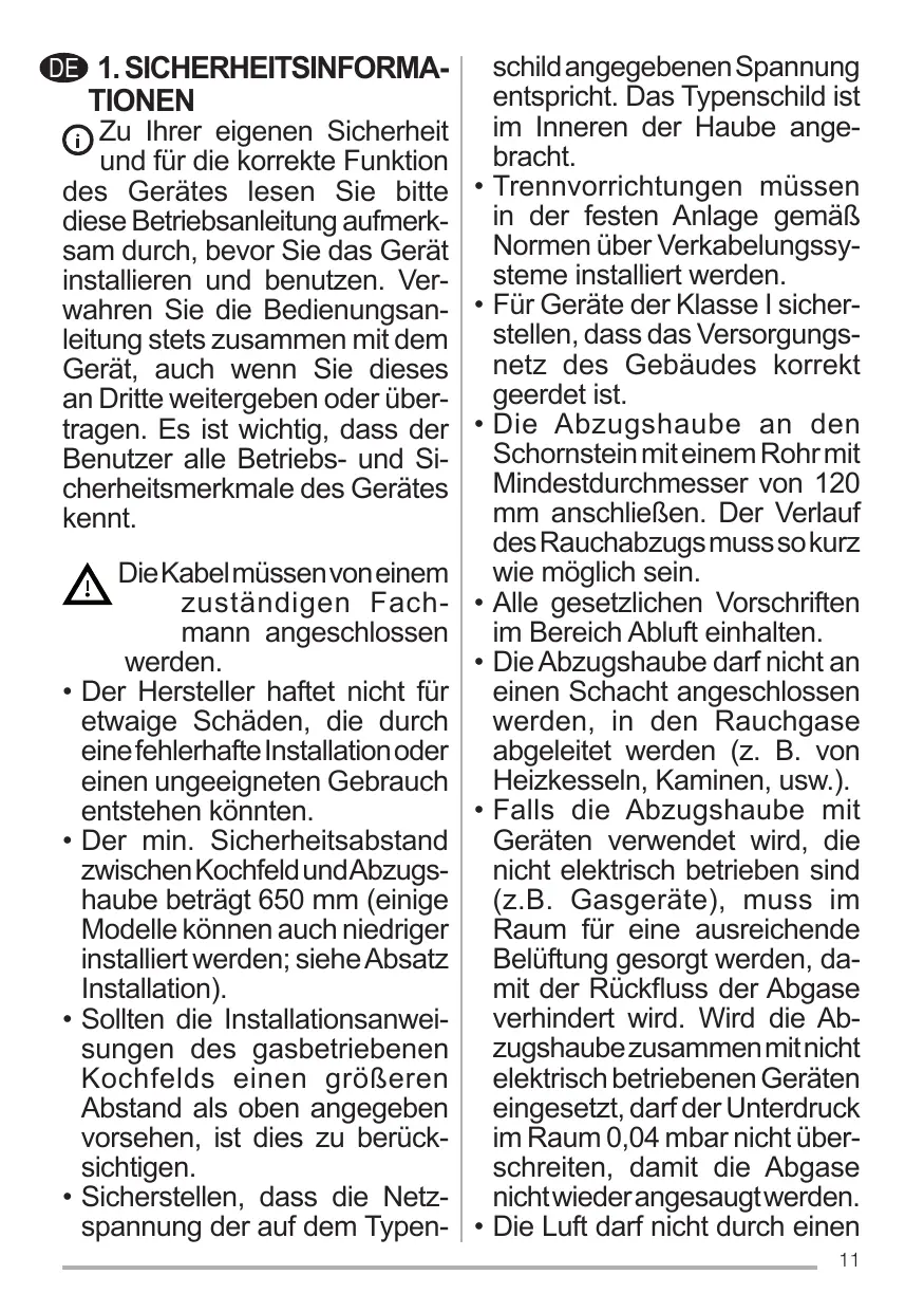 @ 1. SICHERHEITSINFORMA- TIONEN OZ lhrer eigenen Sicherheit und für die korrekte Funktion des Gerätes lesen Sie bitte diese Betriebsanleitung aufmerk- sam durch, bevor Sie das Gerät installieren und benutzen. Ver- wahren Sie die Bedienungsan- leitung stets zusammen mit dem Gerät, auch wenn Sie dieses an Dritte weitergeben oder über- tragen. Es ist wichtig, dass der Benutzer alle Betriebs- und Si- cherheitsmerkmale des Gerätes kennt. DieKabelmüssenvoneinem zuständigen Fach- mann angeschlossen werden. + Der Hersteller haftet nicht für etwaige Schäden, die durch einefehlerhafte Installation oder einen ungeeigneten Gebrauch entstehen kônnten. Der min. Sicherheitsabstand zwischen KochfeldundAbzugs- haube beträgt 650 mm (einige Modelle kônnen auch niedriger installiert werden; siehe Absatz Installation). Sollten die Installationsanwei- sungen des gasbetriebenen Kochfelds einen grôüReren Abstand als oben angegeben vorsehen, ist dies zu berück- sichtigen. + Sicherstellen, dass die Netz- spannung der auf dem Typen- schild angegebenen Spannung entspricht. Das Typenschild ist im Inneren der Haube ange- bracht. Trennvorrichtungen müssen in der festen Anlage gemäR Normen über \/erkabelungssy- steme installiert werden. Für Geräte der Klasse I sicher- stellen, dass das Versorgungs- netz des Gebäudes korrekt geerdet ist. Die Abzugshaube an den Schornstein miteinem Rohr mit Mindestdurchmesser von 120 mm anschlieRen. Der Verlauf des Rauchabzugs muss sokurz wie môglich sein. Alle gesetzlichen Vorschriften im Bereich Abluft einhalten. Die Abzugshaube darf nicht an einen Schacht angeschlossen werden, in den Rauchgase abgeleitet werden (z. B. von Heizkesseln, Kaminen, usw.). Falls die Abzugshaube mit Geräten verwendet wird, die nicht elektrisch betrieben sind (z.B. Gasgeräte), muss im Raum für eine ausreichende Belüftung gesorgt werden, da- mit der Rückfluss der Abgase verhindert wird. Wird die Ab- zugshaube zusammenmitnicht elektrisch betriebenen Geräten eingesetzt, darf der Unterdruck im Raum 0,04 mbar nicht über- schreiten, damit die Abgase nichtwiederangesaugtwerden. - Die Luft darf nicht durch einen