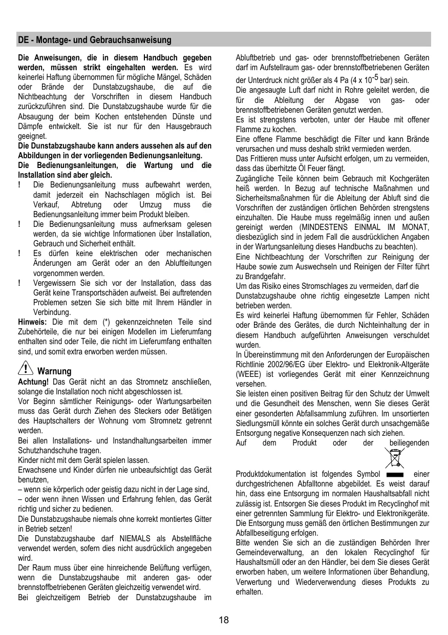 Die Anweisungen, die in thisem Handbuch gegeben werden, müssen strikt eingehalten werden. Es wird keinerlei Haftung übernommen für mögliche Mängel, Schäden oder Brände der Dunstabzugshaube, die auf die Nichtbeachtung der Vorschriften in thisem Handbuch zurückzufahren sind. Die Dunstabzugshaube wurde für die Absaugung der beim Kochen entstehenden Dūnste und Dümpfe entwickelt. Sie ist nur für den Hausgebrauch geeignet.