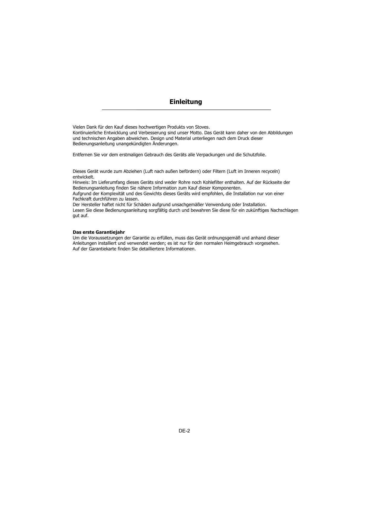 Vielen Dank für den Kauf dieses hochwertigen Produkts von Stoves. Kontinuierliche Entwicklung und Verbesserung sind unser Motto. Das Gerät kann daher von den Abbildungen und technischen Angaben abweichen. Design und Material unterliegen nach dem Druck dieser Bedienungsanleitung unangekündigten Ä nderungen. Entfernen Sie vor dem erstmaligen Gebrauch des Geräts alle Verpackungen und die Schutzfolie. Dieses Gerät wurde zum Abziehen (Luft nach außen befördern) oder Filtern (Luft im Inneren recyceln) entwickelt. Hinweis: Im Lieferumfang dieses Geräts sind weder Rohre noch Kohlefilter enthalten. Auf der Rückseite der Bedienungsanleitung finden Sie nähere Information zum Kauf dieser Komponenten. Aufgrund der Komplexität und des Gewichts dieses Geräts wird empfohlen, die Installation nur von einer Fachkraft durchführen zu lassen. Der Hersteller haftet nicht für Schäden aufgrund unsachgemäßer Verwendung oder Installation. Lesen Sie diese Bedienungsanleitung sorgfältig durch und bewahren Sie diese für ein zukünftiges Nachschlagen gut auf. Das erste Garantiejahr Um die Voraussetzungen der Garantie zu erfüllen, muss das Gerät ordnungsgemäß und anhand dieser Anleitungen installiert und verwendet werden; es ist nur für den normalen Heimgebrauch vorgesehen. Auf der Garantiekarte finden Sie detailliertere Informationen.