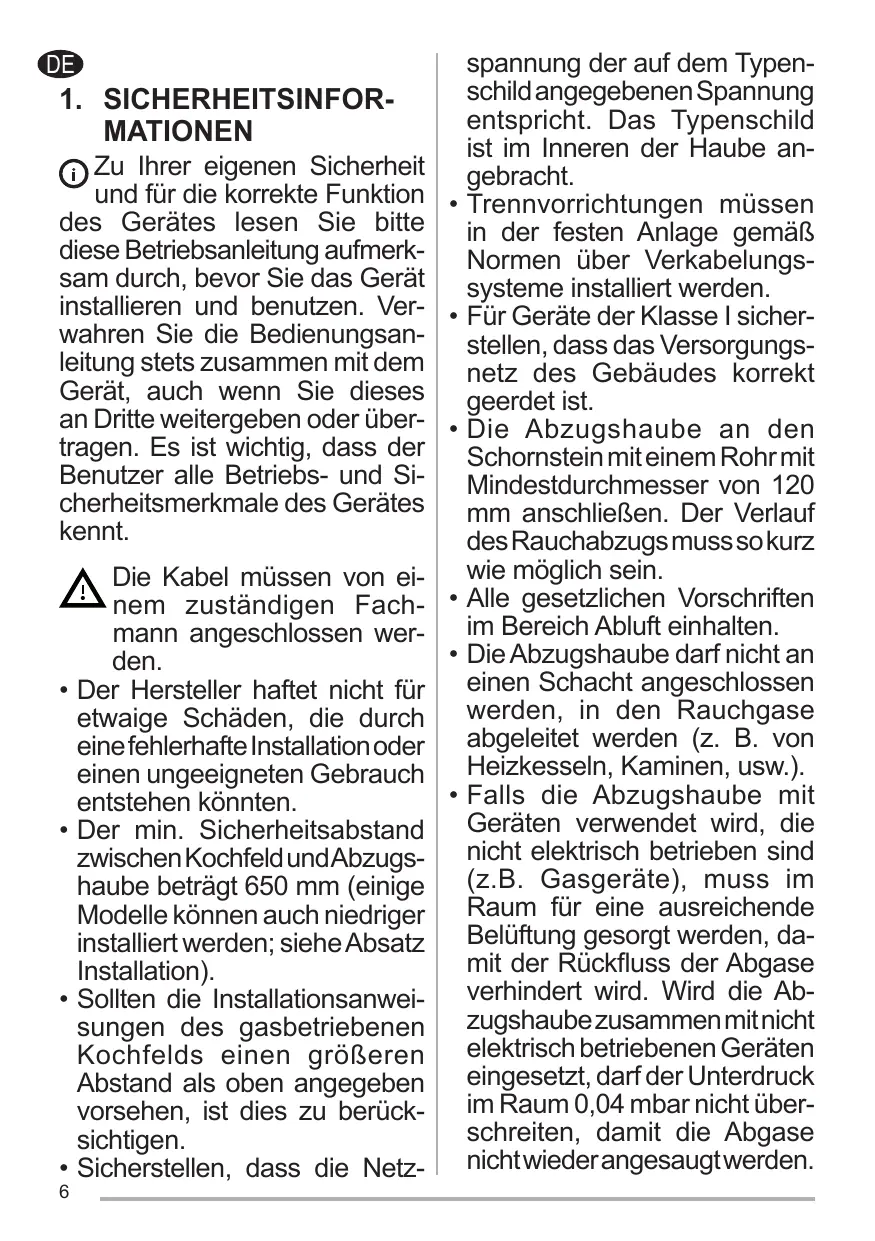 1. SICHERHEITSINFORMATIONEN Zu Ihrer eigenen Sicherheit und für die korrekte Funktion • des Gerätes lesen Sie bitte diese Betriebsanleitung aufmerksam durch, bevor Sie das Gerät installieren und benutzen. Ver- • wahren Sie die Bedienungsanleitung stets zusammen mit dem Gerät, auch wenn Sie dieses an Dritte weitergeben oder über- • tragen. Es ist wichtig, dass der La distance de sécurité mini- • mum entre le plan de cuisson et la hotte aspirante est de 650 mm (certains modèles peuvent être installés à une hauteur inférieure ; voir le paragraphe concernant les dimensions de travail et l’installation). Si les instructions d’installation du plan de cuisson à gaz spécifient une distance supérieure à celle indiquée ci-dessus, veuillez impérativement en tenir compte. Assurez-vous que la tension