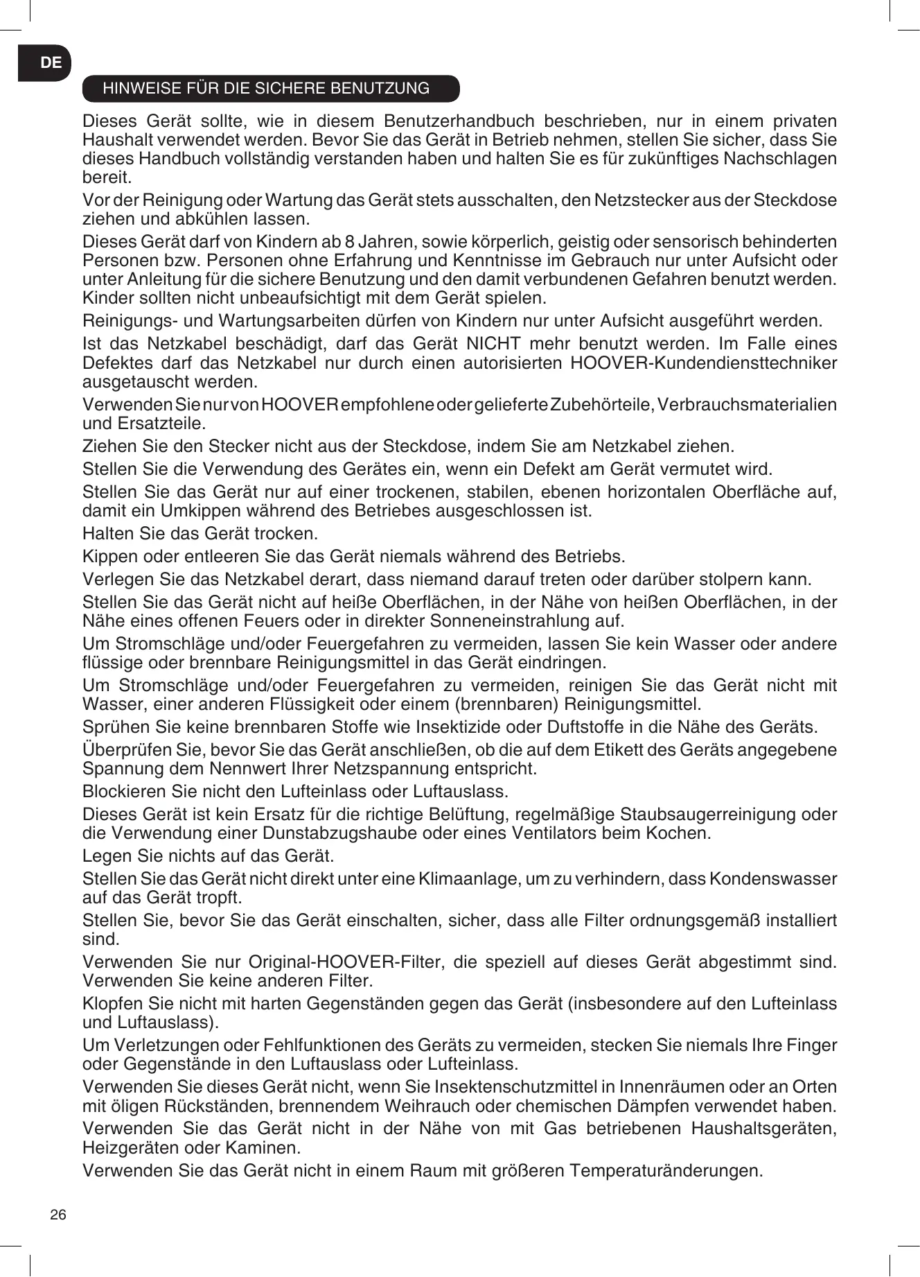 Le nettoyage et l’entretien ne devraient pas être effectués par des enfants sans supervision. Si le cordon d’alimentation est endommagé, arrêtez immédiatement d’utiliser l’appareil. Pour éviter les risques d’accident, un réparateur HOOVER agréé doit remplacer le cordon d’alimentation. N’utilisez que les accessoires, consommables ou pièces détachées recommandés ou fournis par HOOVER. Ne débranchez pas l’appareil en tirant le cordon d’alimentation. Ne continuez pas à utiliser votre appareil s’il semble défectueux. Placez et utilisez l’appareil uniquement sur une surface sèche, stable et à l’horizontale afin d’éviter le basculement. Gardez l’appareil sec. N’inclinez ou ne videz jamais l’appareil pendant le fonctionnement. Posez le cordon d’alimentation de façon à ce que personne ne le piétine ou n’y trébuche. Ne placez pas l’appareil sur des surfaces chaudes, près de surfaces chaudes, près de feux ouverts ou directement exposé aux rayons du soleil. Ne laissez pas que de l’eau ou tout autre liquide ou détergent inflammable pénètre dans l’appareil pour éviter tout risque d’électrocution et/ou d’incendie. Ne nettoyez pas l’appareil avec de l’eau, tout autre liquide ou un détergent (inflammable) pour éviter tout risque d’électrocution et/ou d’incendie. Ne vaporisez pas de produits inflammables comme des insecticides ou des parfumeurs autour de l’appareil. Vérifiez si la tension et les puissances indiquées sur l’étiquette de l’appareil correspondent à la tension d’alimentation locale avant de brancher l’appareil. Ne bloquez pas l’entrée ou la sortie de l’air. Cet appareil ne remplace pas une ventilation correcte, un nettoyage régulier avec l’aspirateur ou l’utilisation d’une hotte aspirante ou d’un ventilateur pendant que vous cuisinez. Ne placez rien sur l’appareil. Ne placez pas l’appareil directement en dessous d’un climatiseur pour éviter que le condensat dégouline dans l’appareil. Assurez-vous que les filtres soient convenablement montés avant d’allumer l’appareil. Utilisez uniquement les filtres originaux HOOVER spécifiques pour cet appareil. N’utilisez pas d’autres filtres. Évitez de frapper contre l’appareil (l’entrée et la sortie de l’air en particulier) avec des objets durs. N’enfilez pas vos doigts ou des objets dans la sortie de l’air ou dans l’entrée de l’air pour éviter des blessures ou un dysfonctionnement de l’appareil. N’utilisez pas cet appareil quand vous avez utilisez des répulsifs pour insectes à fumée intérieure ou dans des endroits avec des résidus d’huile, de l’encens brûlant ou des fumées chimiques. N’utilisez pas cet appareil près d’appareils à gaz, de dispositifs chauffants ou des cheminées. N’utilisez pas l’appareil dans une chambre avec des changements de températures importants. Pour éviter les interférences, placez l’appareil au moins à 2 m de tout appareil électrique qui utilise les ondes radio aériennes comme les TV, les radios et les horloges radio-pilotées. Quand l’appareil n’est pas utilisé pendant longtemps, des bactéries peuvent proliférer sur les 14