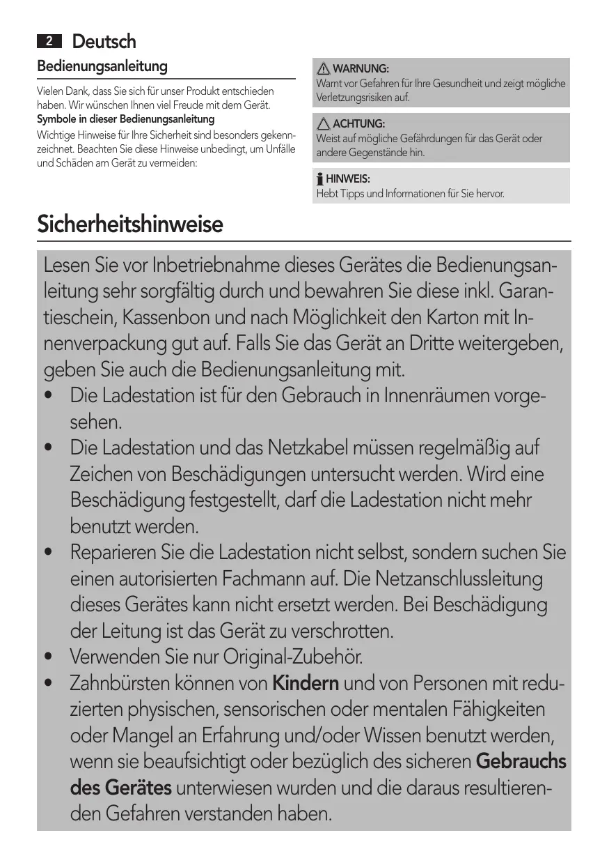 Sicherheitshinweise L esen Sie vor Inbetriebnahme dieses Gerätes die Bedienungsanleitung sehr sorgfältig durch und bewahren Sie diese inkl. Garantieschein, Kassenbon und nach Möglichkeit den Karton mit Innenverpackung gut auf. Falls Sie das Gerät an Dritte weitergeben, geben Sie auch die Bedienungsanleitung mit. • Die Ladestation ist für den Gebrauch in Innenräumen vorge sehen. • Die Ladestation und das Netzkabel müssen regelmäßig auf Zeichen von Beschädigungen untersucht werden. Wird eine Beschädigung festgestellt, darf die Ladestation nicht mehr benutzt werden. • Reparieren Sie die Ladestation nicht selbst, sondern suchen Sie einen autorisierten Fachmann auf. Die Netzanschlussleitung dieses Gerätes kann nicht ersetzt werden. Bei Beschädigung der Leitung ist das Gerät zu verschrotten. • Verwenden Sie nur Original-Zubehör. • Zahnbürsten können von Kindern und von Personen mit reduzierten physischen, sensorischen oder mentalen Fähigkeiten oder Mangel an Erfahrung und/oder Wissen benutzt werden, wenn sie beaufsichtigt oder bezüglich des sicheren Gebrauchs des Gerätes unterwiesen wurden und die daraus resultierenden Gefahren verstanden haben.