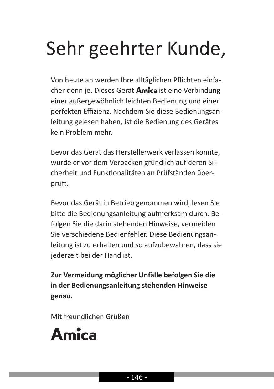 Sehr geehrter Kunde, Von heute an werden Ihre alltäglichen Pflichten einfacher denn je. Dieses Gerät ist eine Verbindung einer außergewöhnlich leichten Bedienung und einer perfekten Effizienz. Nachdem Sie diese Bedienungsanleitung gelesen haben, ist die Bedienung des Gerätes kein Problem mehr. Bevor das Gerät das Herstellerwerk verlassen konnte, wurde er vor dem Verpacken gründlich auf deren Sicherheit und Funktionalitäten an Prüfständen überprüft. Bevor das Gerät in Betrieb genommen wird, lesen Sie bitte die Bedienungsanleitung aufmerksam durch. Befolgen Sie die darin stehenden Hinweise, vermeiden Sie verschiedene Bedienfehler. Diese Bedienungsanleitung ist zu erhalten und so aufzubewahren, dass sie jederzeit bei der Hand ist. Zur Vermeidung möglicher Unfälle befolgen Sie die in der Bedienungsanleitung stehenden Hinweise genau. Mit freundlichen Grüßen