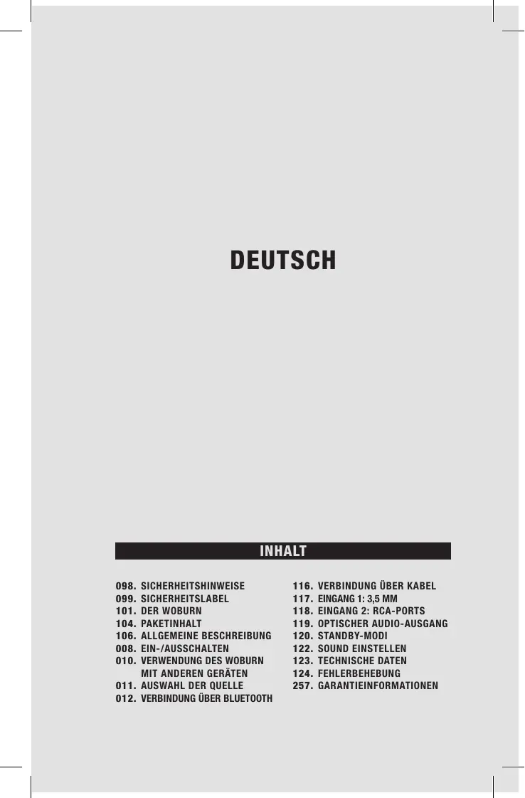 EINGANG 1: 3,5 MM EINGANG 2: RCA-PORTS OPTISCHER AUDIO-AUSGANG STANDBY-MODI SOUND EINSTELLEN TECHNISCHE DATEN FEHLERBEHEBUNG GARANTIEINFORMATIONEN WICHTIGE SICHERHEITSHINWEISE WICHTIGE SICHERHEITSHINWEISE