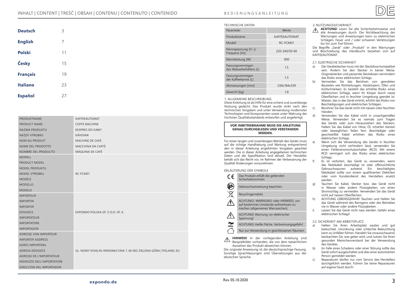 Das Produkt erfüllt die geltenden Sicherheitsnormen. Gebrauchsanweisung beachten. MODELO Recyclingprodukt. IMPORTEUR IMPORTER IMPORTER EXPONDO POLSKA SP. Z O.O. SP. K. IMPORTATEUR IMPORTATORE ACHTUNG!, WARNUNG! oder HINWEIS!, um auf bestimmte Umstände aufmerksam zu machen (allgemeines Warnzeichen). ACHTUNG! Warnung vor elektrischer Spannung! ACHTUNG! Heiße Fläche. Verbrennungsgefahr! IMPORTADOR Nur zur Verwendung in geschlossenen Räumen.