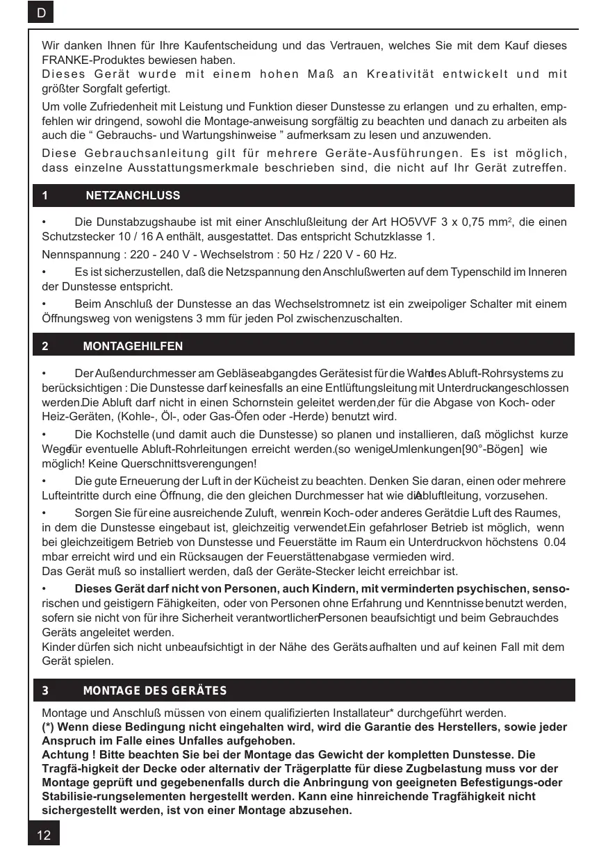 D Wir danken Ihnen für Ihre Kaufentscheidung und das Vertrauen, welches Sie mit dem Kauf dieses FRANKE-Produktes bewiesen haben. Dieses Gerät wurde mit einem hohen Maß an Kreativität entwickelt und mit größter Sorgfalt gefertigt. Um volle Zufriedenheit mit Leistung und Funktion dieser Dunstesse zu erlangen und zu erhalten, empfehlen wir dringend, sowohl die Montage-anweisung sorgfältig zu beachten und danach zu arbeiten als auch die “ Gebrauchs- und Wartungshinweise ” aufmerksam zu lesen und anzuwenden. Diese Gebrauchsanleitung gilt für mehrere Geräte-Ausführungen. Es ist möglich, dass einzelne Ausstattungsmerkmale beschrieben sind, die nicht auf Ihr Gerät zutreffen. 1