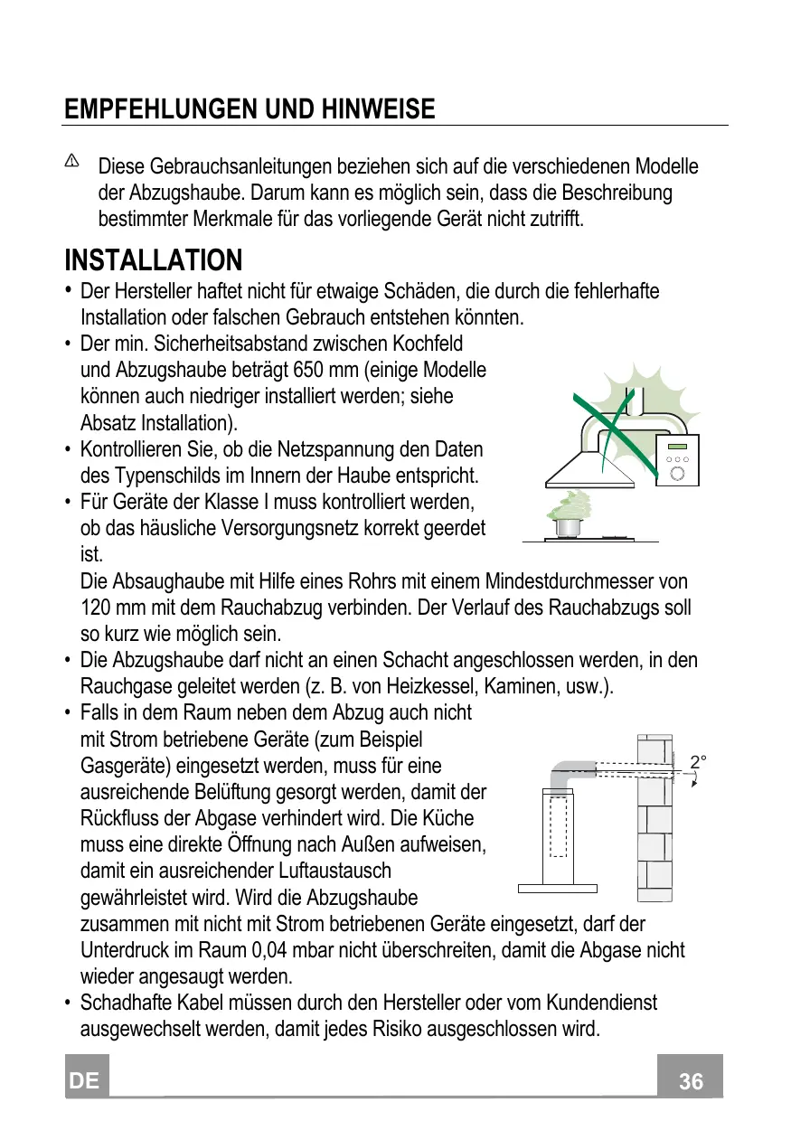 - Die Abzugshaube darf nicht an einen Schacht angeschlossen werden, in den Rauchgase geleitet werden (z. B. von Heizkessel, Kaminen, usw.).