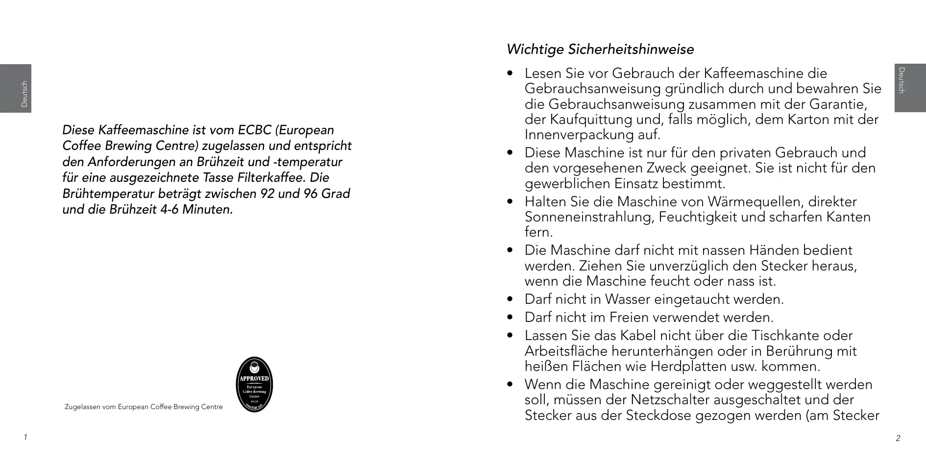 Diese Kaffeemaschine ist vom ECBC (European Coffee Brewing Centre) zugelassen und entspricht den Anforderungen an Brühzeit und -temperatur für eine ausgezeichnete Tasse Filterkaffee. Die Brühtemperatur beträgt zwischen 92 und 96 Grad und die Brühzeit 4-6 Minuten. Zugelassen vom European Coffee Brewing Centre