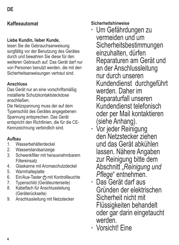die Funktionssicherheit des Gerätes beeinträchtigen könnten. Falls das Gerät z.B. zu Boden gefallen ist oder an der Anschlussleitung gezogen wurde, können von außen nicht erkennbare Schäden vorliegen. In diesen Fällen das Gerät nicht in Betrieb nehmen. Das Gerät auf eine ebene rutschfeste und wasserunempfindliche Fläche stellen. Weder das Gehäuse noch die Anschlussleitung dürfen einer heißen Kochplatte oder offenem Feuer zu nahe kommen. Bevor der Kaffeeautomat geöffnet oder Zubehör entnommen wird, muss das ausgeschaltete Gerät erst abkühlen. Andernfalls kann heißes Wasser oder Dampf austreten. Das Gerät während des Betriebs nicht unbeaufsichtigt lassen. Den Netzstecker ziehen, - bei Störungen während des Betriebes, - nach jedem Gebrauch, - vor jeder Reinigung. Den Netzstecker nicht an der Anschlussleitung aus der Steckdose ziehen, sondern den Netzstecker anfassen. Die Anschlussleitung nicht herunterhängen lassen und von heißen Geräteteilen fernhalten. Wird das Gerät falsch bedient, oder zweckentfremdet verwendet, kann keine Haftung für evtl. auftretende Schäden übernommen werden. Automatische Abschaltung Um unnötigen Stromverbrauch zu vermeiden, schaltet sich das Gerät und damit die Beheizung der Warmhalteplatte ca. 35 Minuten nach dem Ende des Kaffeedurchlaufs automatisch ab. Erste Inbetriebnahme Vor der ersten Kaffeezubereitung ca. 2-3 Wasserdurchläufe mit max. Tassenzahl kaltem Wasser ohne Kaffeemehl durchführen. Dieses gilt auch, wenn der Automat einmal über längere Zeit nicht benutzt wurde oder nach einer Entkalkung. Allgemein ∙ Am Wasserbehälter und an der Kanne befindet sich eine Wasserstandsanzeige zur Dosierung der Frischwassermenge. Die linke Wasserstandsanzeige gilt für normalgroße Tassen mit einem Inhalt von ca. 125 ml, die rechte für kleine Tassen. Die angegebene max. Tassenzahl nicht überschreiten. ∙ Sind mehrere Brühvorgänge hintereinander erforderlich, so ist nach jedem Brühvorgang der Kaffeeautomat auszuschalten und eine Abkühlpause (ca. 5 Min.) einzulegen. ∙ Wichtig: Beim Einfüllen von Frischwasser kurz nach dem Brühvorgang kann heißer Dampf aus dem Wasserauslauf austreten (Verbrühungsgefahr). Kaffeezubereitung ∙ Wasser einfüllen: Wasserbehälterdeckel öffnen, gewünschte Menge kaltes Wasser in den Wasserbehälter füllen und Deckel schließen. ∙ Papierfilter einlegen: Schwenkfilter aufschwenken und in den Filtereinsatz einen Papierfilter Größe 4 einlegen. Vorher die perforierten Seiten umknicken. ∙ Kaffeemehl einfüllen: Wir empfehlen für jede normalgroße Tasse (125 ml) ca. 6 g = 1½-2 Teelöffel mittelfein bis fein gemahlenes Kaffeemehl zu verwenden. Anschließend Schwenkfilter zuschwenken. ∙ Kanne vorbereiten: Kanne mit dem Aromaschutzdeckel verschließen und in das Gerät stellen. Durch den Deckel wird der Tropfverschluss im Schwenkfilter während des Brühvorganges geöffnet. ∙ Brühvorgang starten: Netzstecker einstecken und den Kaffeeautomaten mit dem Taster einschalten. Der Wasserdurchlauf beginnt. ∙ Kaffee entnehmen: Wasserdurchlauf durch den Filter abwarten und die Kanne entnehmen. ∙ Kaffeeautomat ausschalten: Der Kaffee kann zum Warmhalten mit der Glaskanne auf die Warmhalteplatte gestellt werden. Das Gerät dann nach der letzten Kaffeeentnahme mit dem Taster ausschalten. Wird das Gerät nicht ausgeschaltet, wird die Warmhalteplatte noch ca. 35 Minuten nach Ende des Kaffeedurchlaufs beheizt. Danach schaltet sich das Gerät automatisch ab. Nach der Benutzung des Gerätes den Netzstecker ziehen. Reinigung und Pflege ∙ Vor jeder Reinigung den Netzstecker ziehen und das Gerät abkühlen lassen. ∙ Den Kaffeeautomaten aus Gründen der elektrischen Sicherheit niemals in Flüssigkeiten tauchen, sondern mit einem angefeuchteten Tuch, dem etwas Spülmittel beigegeben wurde, abwischen und trockenreiben. ∙ Keine Scheuermittel oder aggressiven Reiniger verwenden. ∙ Zur Entnahme des verbrauchten Kaffeemehls den Schwenkfilter aufschwenken und den Filtereinsatz entnehmen. Papierfilter mit verbrauchtem Kaffeemehl entsorgen. Das Kaffeemehl kann kompostiert werden. ∙ Den Filtereinsatz spülen, abtrocknen und wieder einsetzen. ∙ Den Schwenkfilter zuschwenken. ∙ Die Kaffeekanne mit Deckel und den Filtereinsatz nach dem Gebrauch in der Spülmaschine oder im Spülwasser reinigen. ∙ Zur leichteren Reinigung den Deckel der Kaffeekanne öffnen und nach oben abziehen. Nach der Reinigung mit leichtem Druck wieder einsetzen.