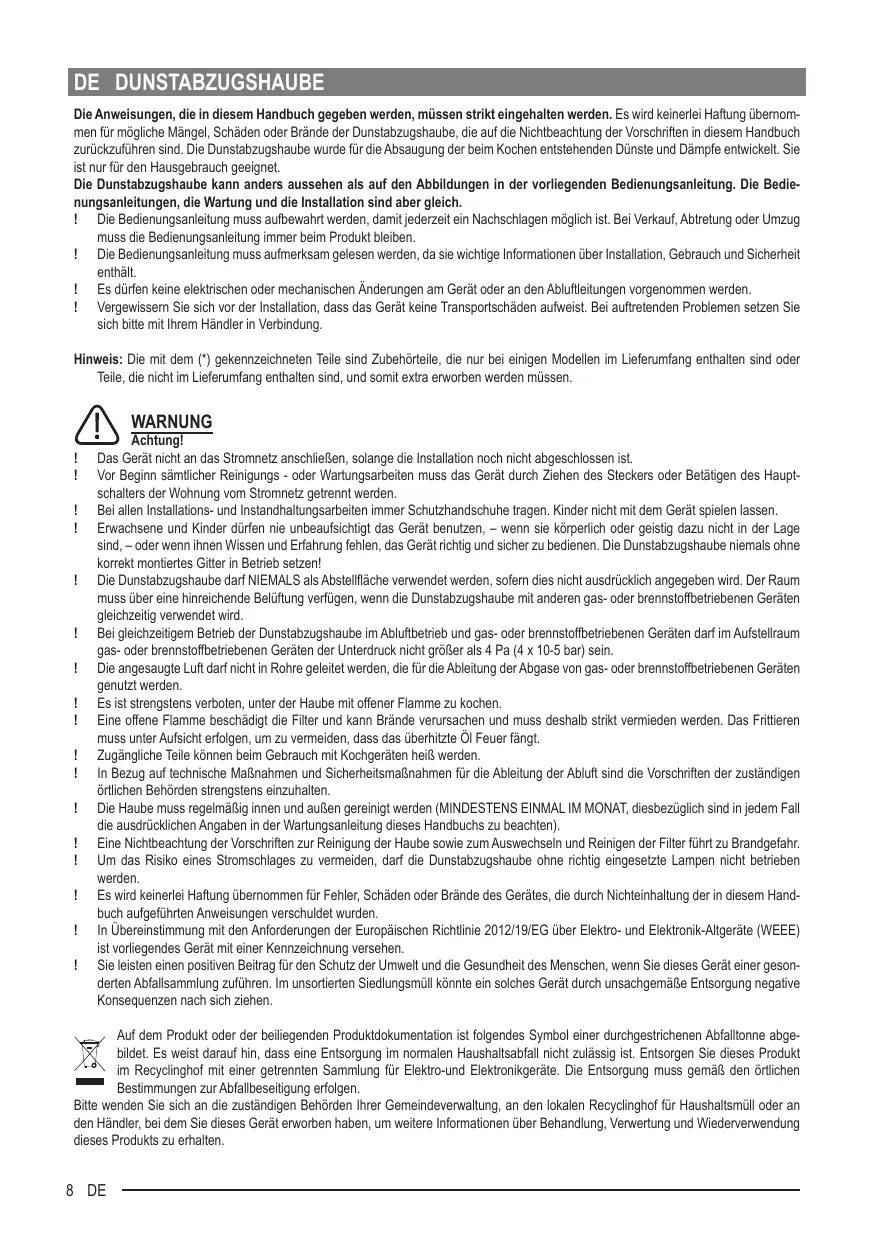L’appareil n’est pas destiné à une utilisation par des enfants ou des personnes à capacités physiques, sensorielles ou mentales réduites et sans expérience et connaissance à moins qu’ils ne soient sous la supervision ou formés sur l’utilisation de l’appareil par une personne responsable de leur sécurité. Les enfants doivent être surveillés afin qu’ils ne jouent pas avec l’appareil. Ne jamais utiliser la hotte sans que la grille ne soit montée correctement! La hotte ne doit JAMAIS être utilisée comme plan pour déposer quelque chose sauf si cela est expressément indiqué. Quand la hotte est utilisée en même temps que d’autres appareils à combustion de gaz ou d’autres combustibles, le local doit disposer d’une ventilation suffisante. L’air aspiré ne doit jamais être envoyé dans un conduit utilisé pour l’évacuation des fumées produites par des appareils à combustion de gaz ou d’autres combustibles. Il est formellement interdit de faire flamber les aliments sous la hotte. L’utilisation de flammes libres peut entraîner des dégâts aux filtres et peut donner lieu à des incendies, il faut donc les éviter à tout prix. La friture d’aliments doit être réalisée sous contrôle pour éviter que l’huile surchauffée ne prenne feu. Les pièces accessibles peuvent se réchauffer de façon importante quand elles sont utilisées avec des appareils pour la cuisson. En ce qui concerne les mesures techniques et de sécurité à adopter pour l’évacuation des fumées, s’en tenir strictement à ce qui est prévu dans les règlements des autorités locales compétentes. La hotte doit être régulièrement nettoyée, aussi bien à l’intérieur qu’à l’extérieur (AU MOINS UNE FOIS PAR MOIS, respecter néanmoins les instructions relatives à l’entretien fournies dans ce manuel). La non observation de ces normes de nettoyage de la hotte et du changement et nettoyage des filtres comporte des risques d’incendie. Ne pas utiliser ou laisser la hotte sans que les ampoules soient correctement placées pour éviter tout risque de choc électrique. La société décline toute responsabilité pour d’éventuels inconvénients, dégâts ou incendies provoqués par l’appareil et dérivés de la non observation des instructions reprises dans ce manuel. Cet appareil porte le symbole du recyclage conformément à la Directive Européenne 2002/96/CE concernant les Déchets d’Équipements Électriques et Électroniques (DEEE ou WEEE). En procédant correctement à la mise au rebut de cet appareil, vous contribuerez à empêcher toute conséquence nuisible pour l’environnement et la santé de l’homme.