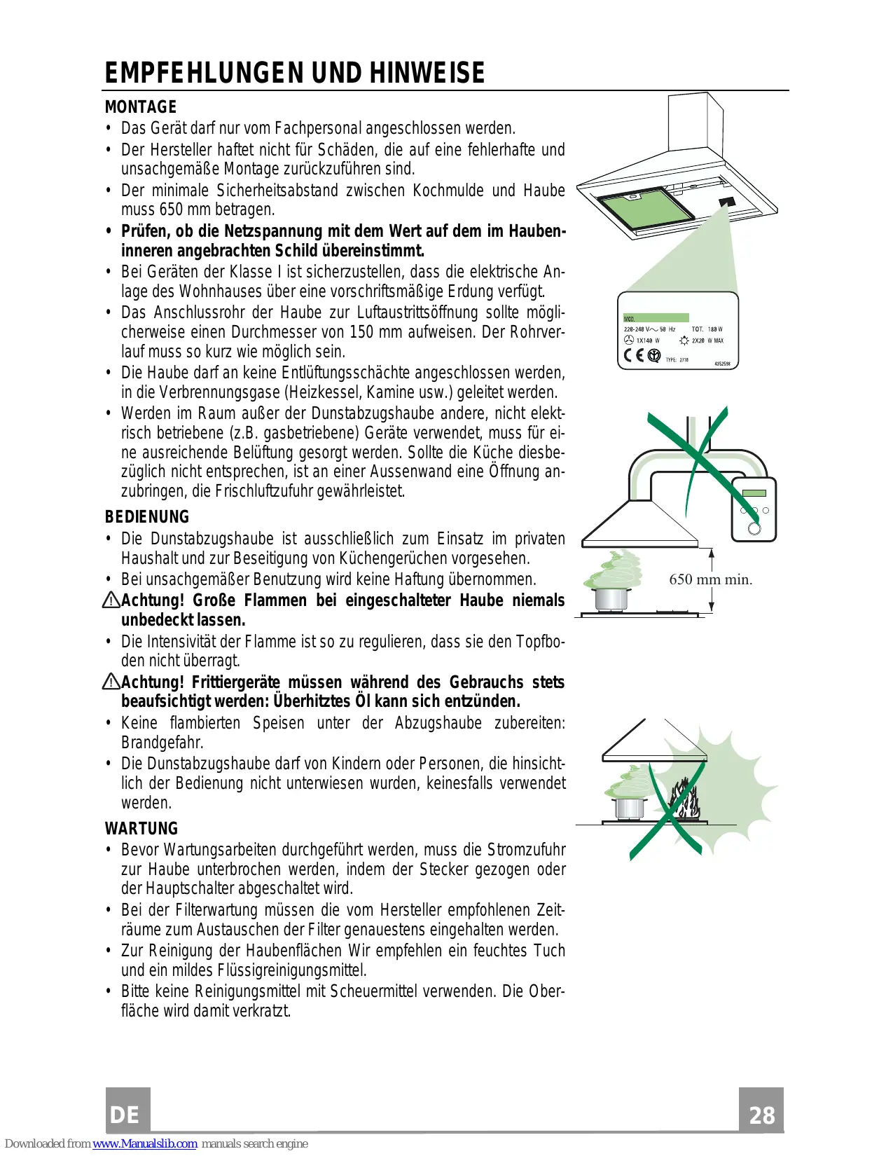 EMPFEHLUNGEN UND HINWEISE MONTAGE • Das Gerät darf nur vom Fachpersonal angeschlossen werden. • Der Hersteller haftet nicht für Schäden, die auf eine fehlerhafte und unsachgemäße Montage zurückzuführen sind. • Der minimale Sicherheitsabstand zwischen Kochmulde und Haube muss 650 mm betragen. • Prüfen, ob die Netzspannung mit dem Wert auf dem im Haubeninneren angebrachten Schild übereinstimmt. • Bei Geräten der Klasse I ist sicherzustellen, dass die elektrische Anlage des Wohnhauses über eine vorschriftsmäßige Erdung verfügt. • Das Anschlussrohr der Haube zur Luftaustrittsöffnung sollte möglicherweise einen Durchmesser von 150 mm aufweisen. Der Rohrverlauf muss so kurz wie möglich sein. • Die Haube darf an keine Entlüftungsschächte angeschlossen werden, in die Verbrennungsgase (Heizkessel, Kamine usw.) geleitet werden. • Werden im Raum außer der Dunstabzugshaube andere, nicht elektrisch betriebene (z.B. gasbetriebene) Geräte verwendet, muss für eine ausreichende Belüftung gesorgt werden. Sollte die Küche diesbezüglich nicht entsprechen, ist an einer Aussenwand eine Öffnung anzubringen, die Frischluftzufuhr gewährleistet. BEDIENUNG • Die Dunstabzugshaube ist ausschließlich zum Einsatz im privaten Haushalt und zur Beseitigung von Küchengerüchen vorgesehen. • Bei unsachgemäßer Benutzung wird keine Haftung übernommen. Achtung! Große Flammen bei eingeschalteter Haube niemals unbedeckt lassen. • Die Intensivität der Flamme ist so zu regulieren, dass sie den Topfboden nicht überragt. Achtung! Frittiergeräte müssen während des Gebrauchs stets beaufsichtigt werden: Überhitztes Öl kann sich entzünden. • Keine flambierten Speisen unter der Abzugshaube zubereiten: Brandgefahr. • Die Dunstabzugshaube darf von Kindern oder Personen, die hinsichtlich der Bedienung nicht unterwiesen wurden, keinesfalls verwendet werden. WARTUNG • Bevor Wartungsarbeiten durchgeführt werden, muss die Stromzufuhr zur Haube unterbrochen werden, indem der Stecker gezogen oder der Hauptschalter abgeschaltet wird. • Bei der Filterwartung müssen die vom Hersteller empfohlenen Zeiträume zum Austauschen der Filter genauestens eingehalten werden. • Zur Reinigung der Haubenflächen Wir empfehlen ein feuchtes Tuch und ein mildes Flüssigreinigungsmittel. • Bitte keine Reinigungsmittel mit Scheuermittel verwenden. Die Oberfläche wird damit verkratzt.