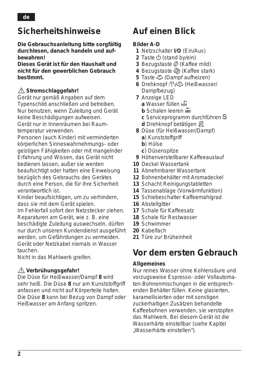 (aprox. 125 ml) para una taza de café suave o fuerte se puede modificar. ● Mantener pulsada la tecla 5 o K hasta que se haya obtenido la cantidad desea da de café (se puede elegir entre aprox. 30 hasta aprox. 220 ml). i Esta cantidad se puede volver a modificar en cualquier momento. Si se desea reponer de nuevo el ajuste de fábrica de aprox. 125 ml, se puede realizar un “reset”. Reset: Poner la máquina en modo “stand by” y extraer los recipientes 17 y 18. Pulsar las teclas para hacer café 5 y K a la vez durante como mínimo 5 seg. Los LED 7a,b,c y d (H, I, S, J) parpadean brevemente. Colocar de nuevo los recipien tes 17 y 18 y volver a encender la máquina mediante la tecla a. ! ¡Peligro de quemadura!