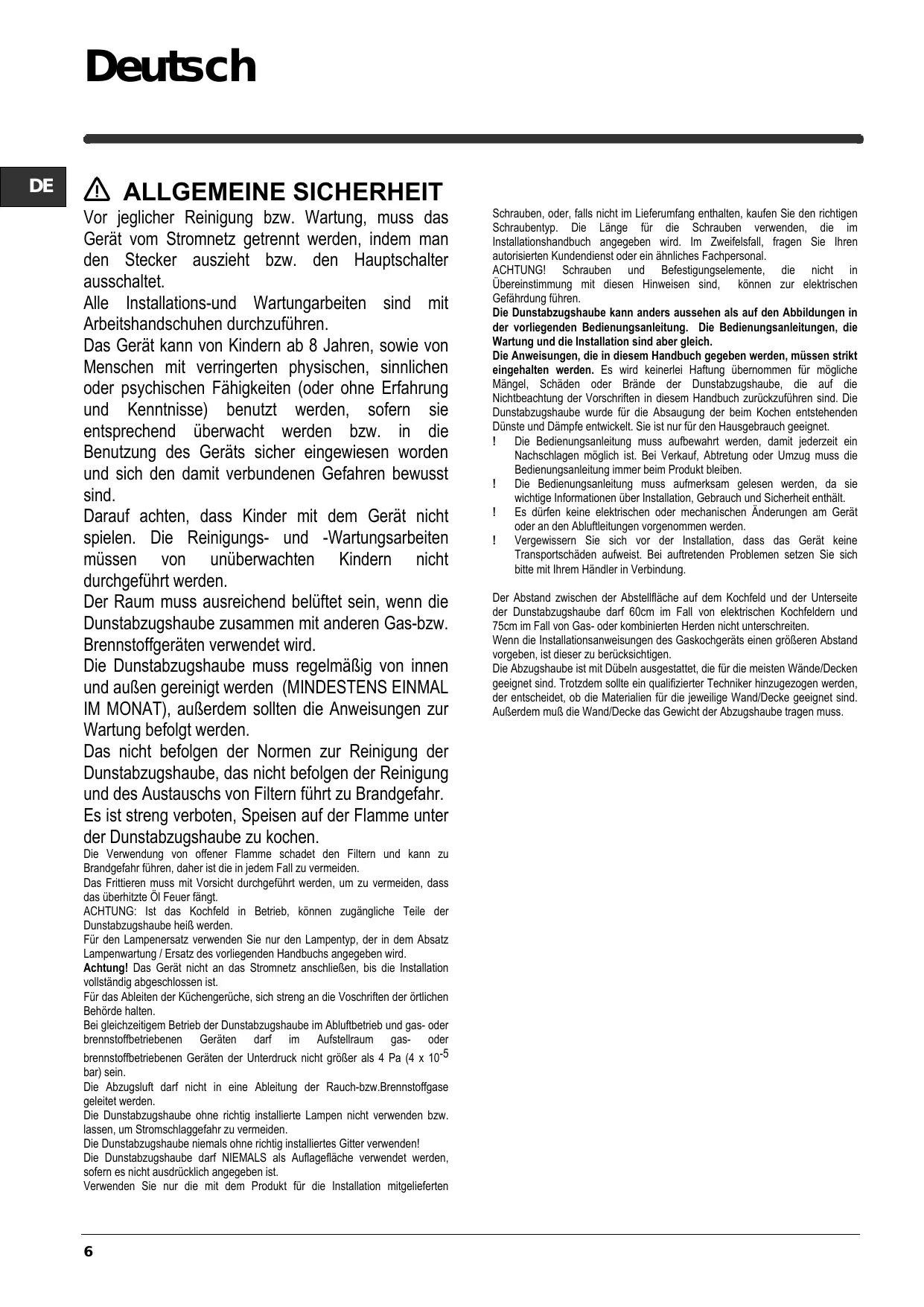 La pièce doit avoir une aération suffisante lorsque la hotte est utilisée conjointement avec d'autres appareils fonctionnant au gaz ou autres combustibles. La hotte doit être régulièrement nettoyée à la fois à l'intérieur et à l'extérieur (AU MOINS UNE FOIS PAR MOIS); cela devrait se faire en conformité avec les instructions d'entretien. Le non respect des instructions expressément fournies concernant le nettoyage de la hotte et des filtres peut provoquer des risques d'incendie. Ne pas flamber d’aliments sous la hotte.