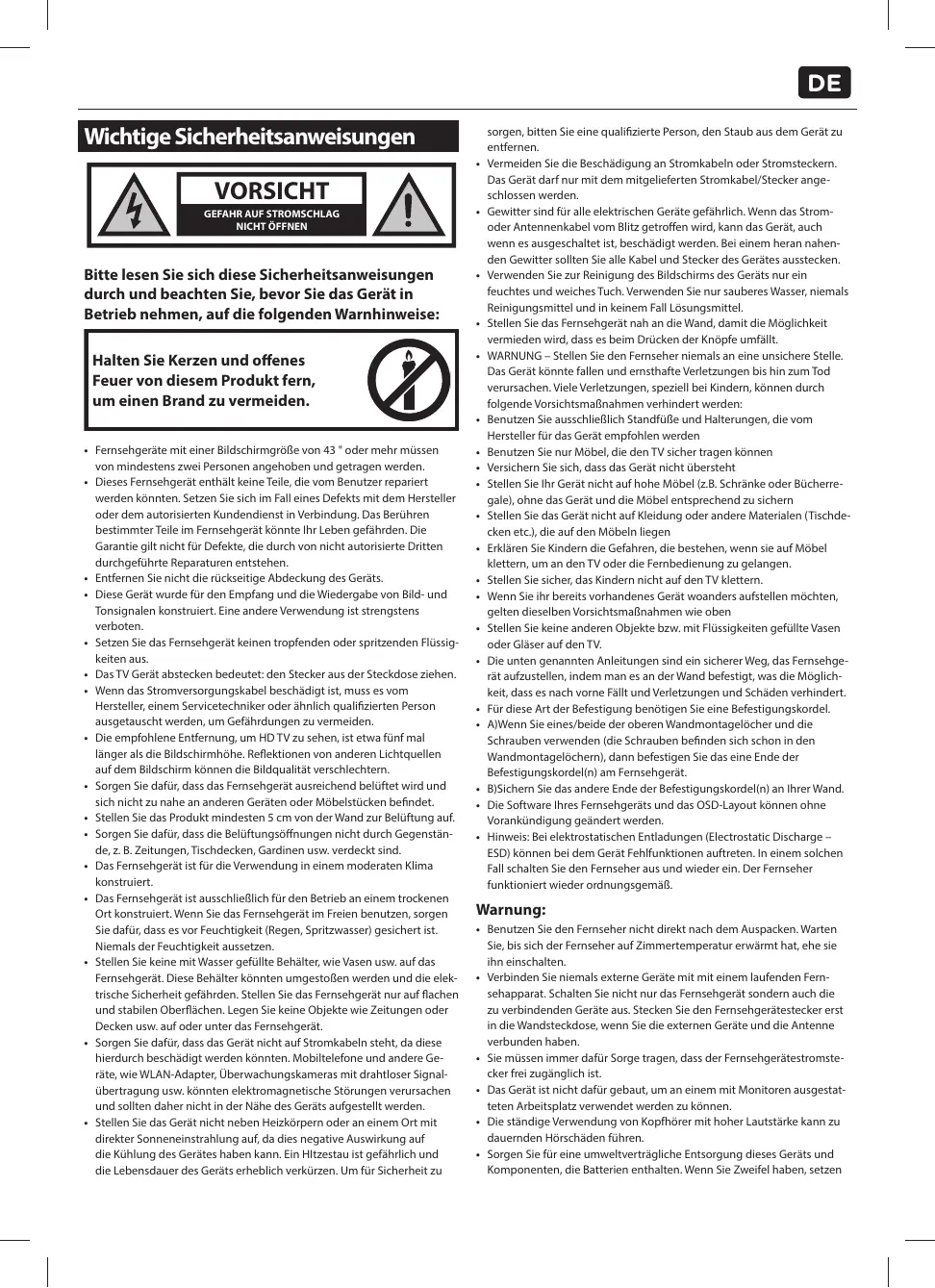 VORSICHT GEFAHR AUF STROMSCHLAG NICHT ÖFFNEN Bitte lesen Sie sich diese Sicherheitsanweisungen durch und beachten Sie, bevor Sie das Gerät in Betrieb nehmen, auf die folgenden Warnhinweise: Halten Sie Kerzen und offenes Feuer von diesem Produkt fern, um einen Brand zu vermeiden.