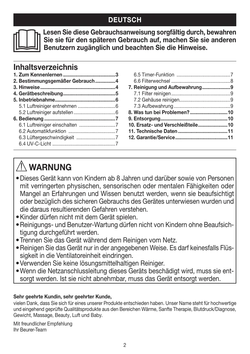 - Wenn die Netzanschlussleitung dieses Geräts beschädigt wird, muss sie entsorgt werden. Ist sie nicht abnehmbar, muss das Gerät entsorgt werden. Sehr geehrte Kundin, sehr geehrter Kunde, vielen Dank, dass Sie sich für eines unserer Produkte entschieden haben. Unser Name steht für hochwertige und eingehend geprüfte Qualitätsprodukte aus den Bereichen Wärme, Sanfte Therapie, Blutdruck/Diagnose, Gewicht, Massage, Beauty, Luft und Baby. Mit freundlicher Empfehlung Ihr Beurer-Team