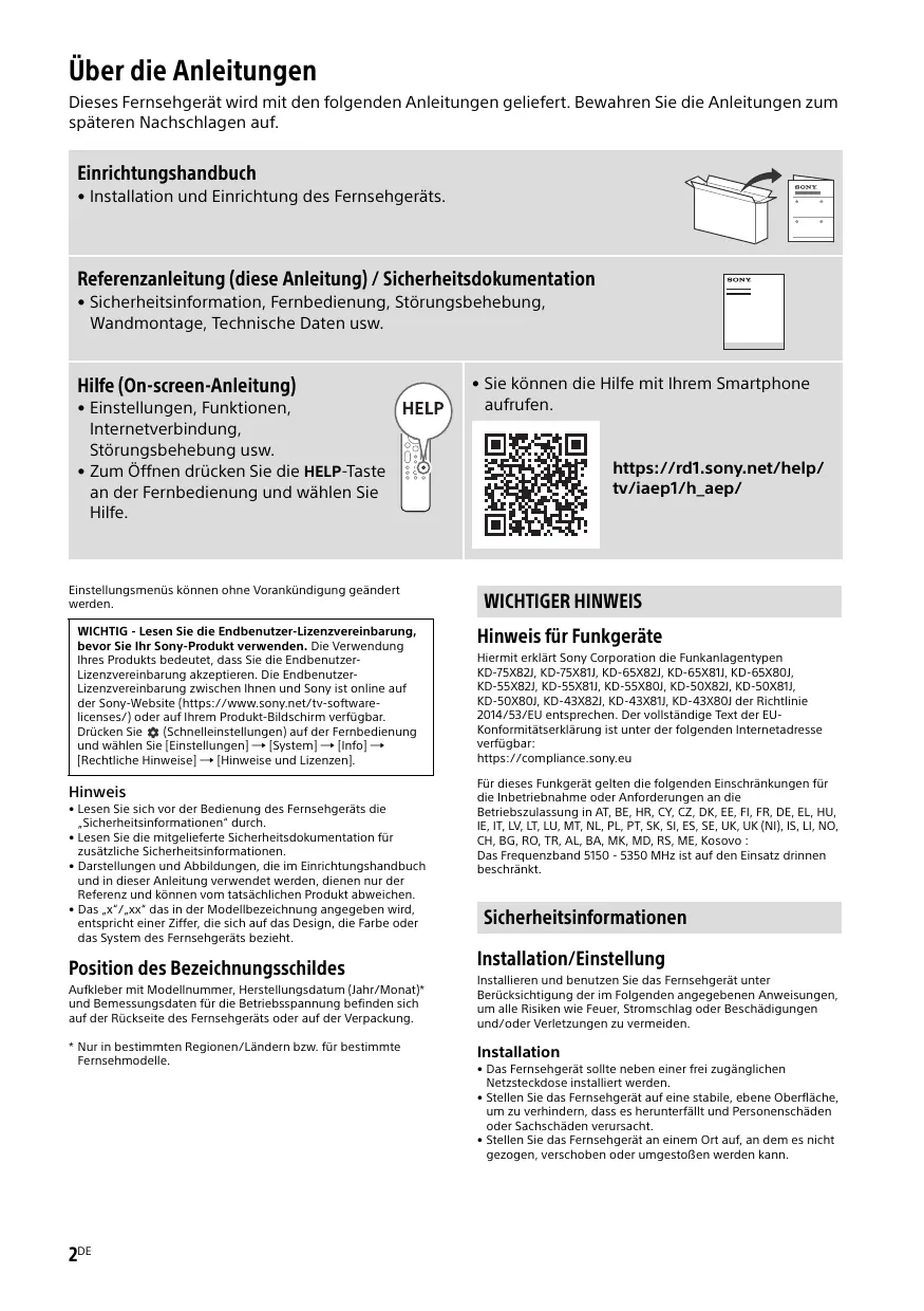 Hinweis • Lesen Sie sich vor der Bedienung des Fernsehgeräts die „Sicherheitsinformationen“ durch. • Lesen Sie die mitgelieferte Sicherheitsdokumentation für zusätzliche Sicherheitsinformationen. • Darstellungen und Abbildungen, die im Einrichtungshandbuch und in dieser Anleitung verwendet werden, dienen nur der Referenz und können vom tatsächlichen Produkt abweichen. • Das „x“/„xx“ das in der Modellbezeichnung angegeben wird, entspricht einer Ziffer, die sich auf das Design, die Farbe oder das System des Fernsehgeräts bezieht.