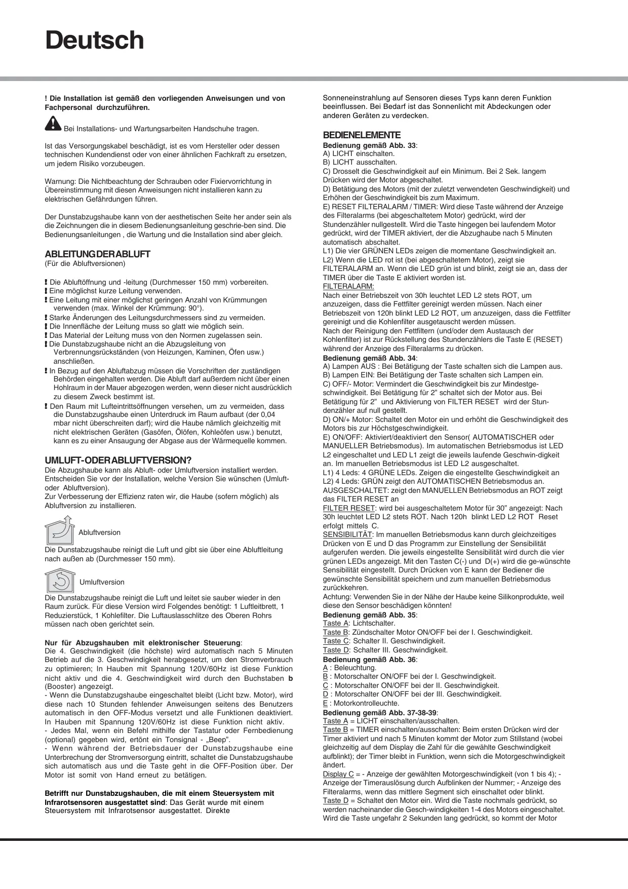 In Bezug auf den Abluftabzug müssen die Vorschriften der zuständigen Behörden eingehalten werden. Die Abluft dar aufüberdem nicht über einen Hohliaum in der Mauer abbezogen werden, wenn dieser nicht ausdrücklich zu diesen Zweck bestimmt ist.